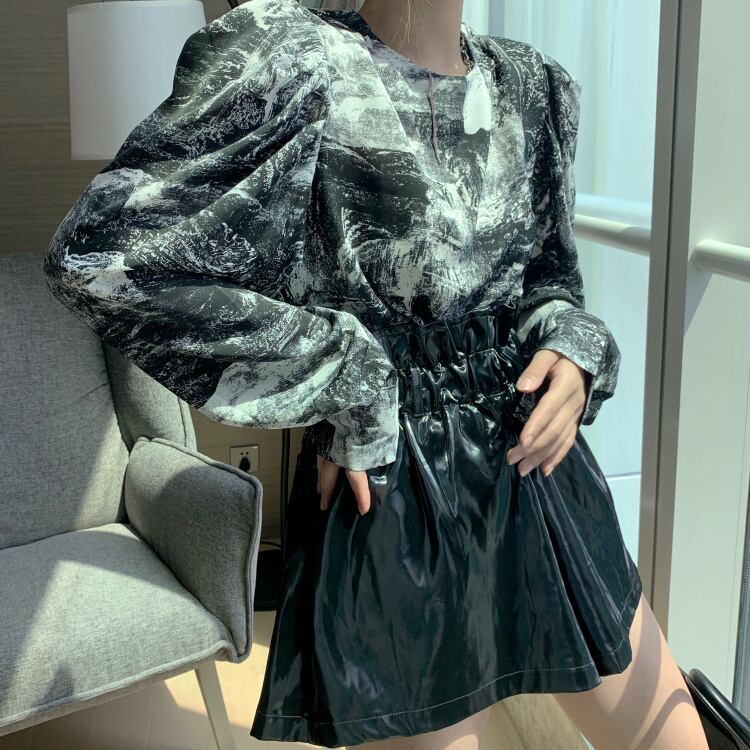 色:インクカラートップ,光沢のある黒のショートパンツ