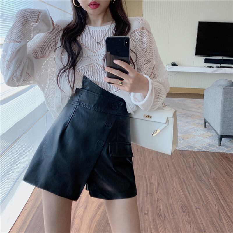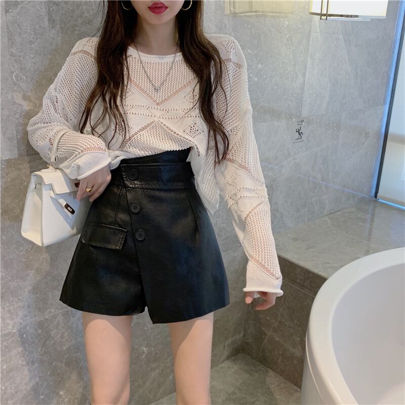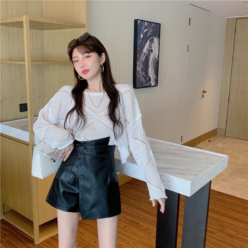 ホワイト薄手ニットTシャツ オータムハイウェストレザーパンツ ショーツ ロング 秋物 ブルマー ガールズファッション91022912023
