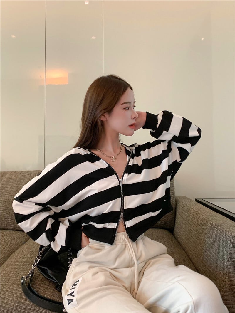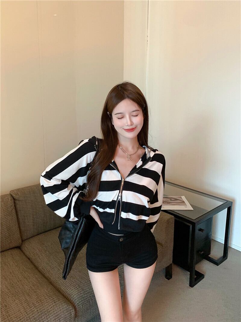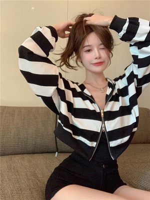 ストライプセーター トップス オータムルーズショートジッパーカーディガンジャケット 秋物 ガールズファッション17169891527