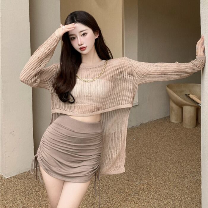 薄手ニットブラウス ハイウェストウェストギャザースカート サマー ストリート 夏物 ガールズファッション10474877789