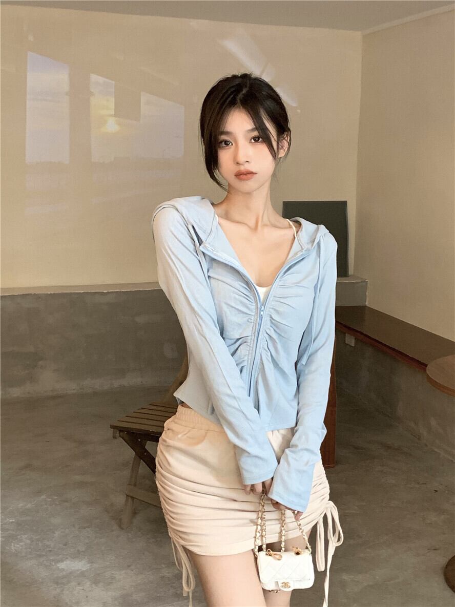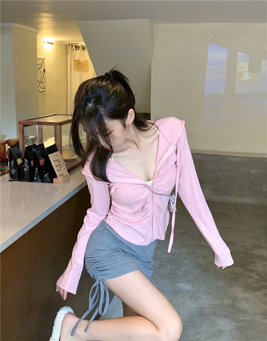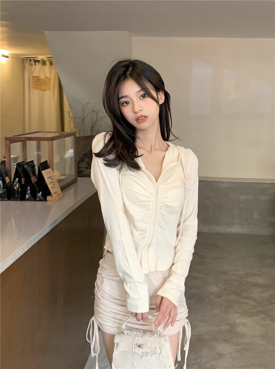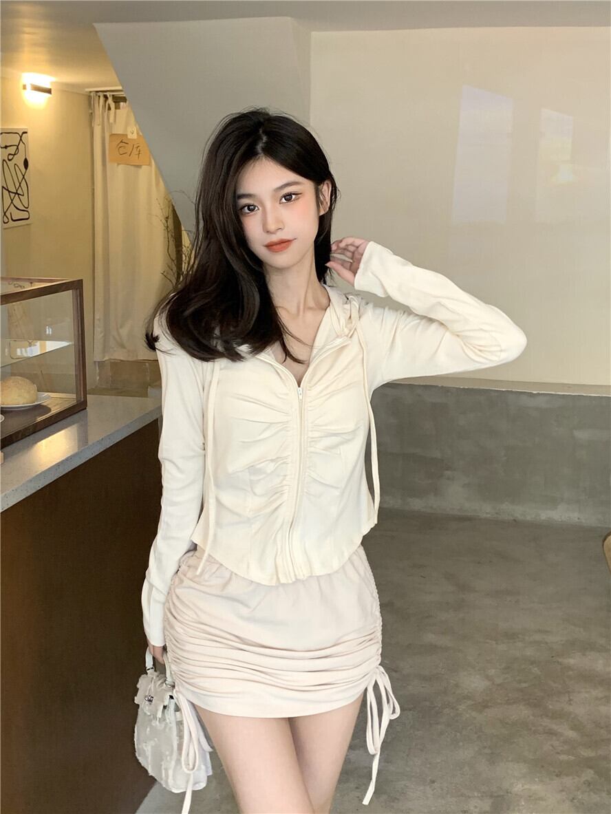 オータムスリムフードカーディガンシャツ プリーツハイウェストウェストスカート ロング 秋物 ガールズファッション54764871876