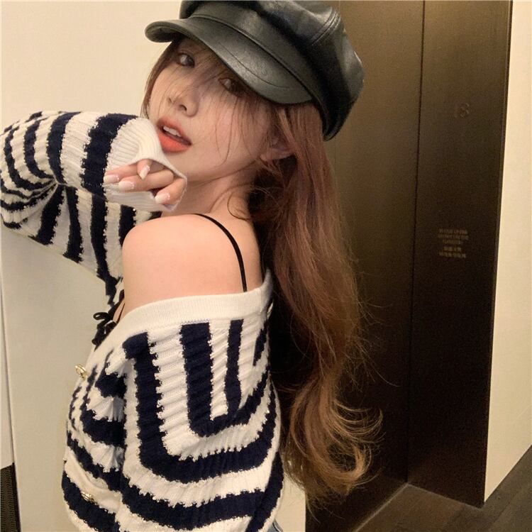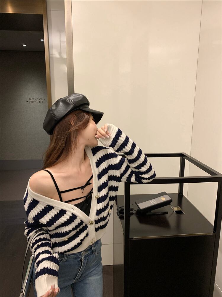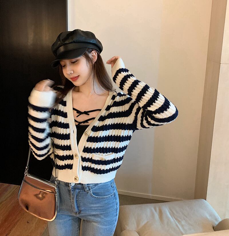オータムスタイル薄手Vネックストライプニットカーディガンリボン ロング 秋物 ガールズファッション37360770600