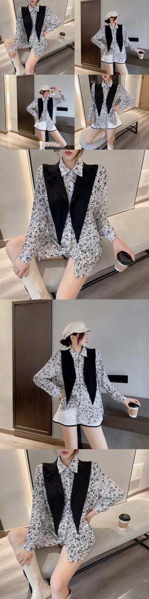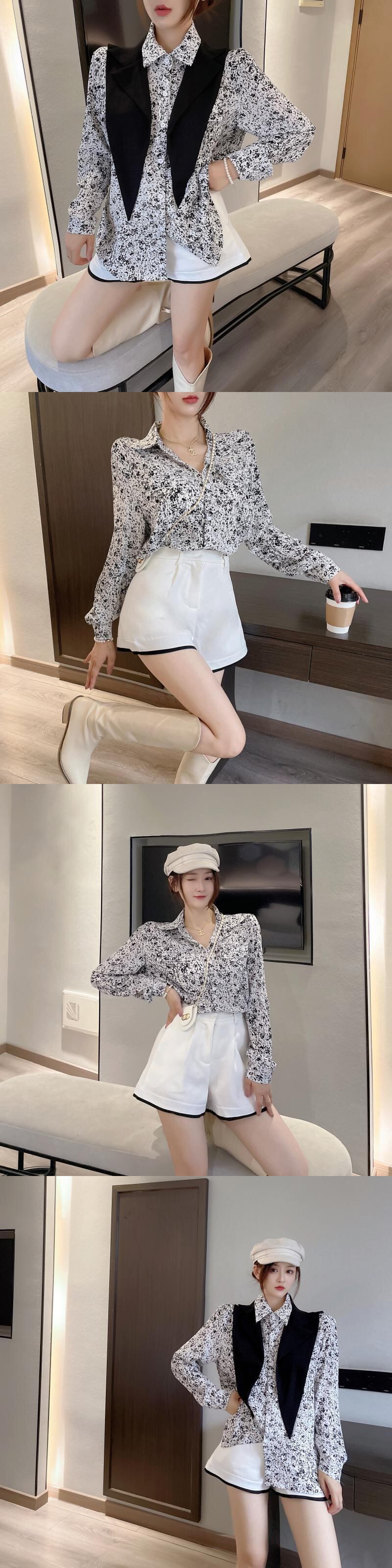 スタンダードフローラルシャツ オータムカラーハイウェストウェストスリムパンツ ショーツ レトロ 秋物 ブルマー 花柄 ガールズファッション72985576105