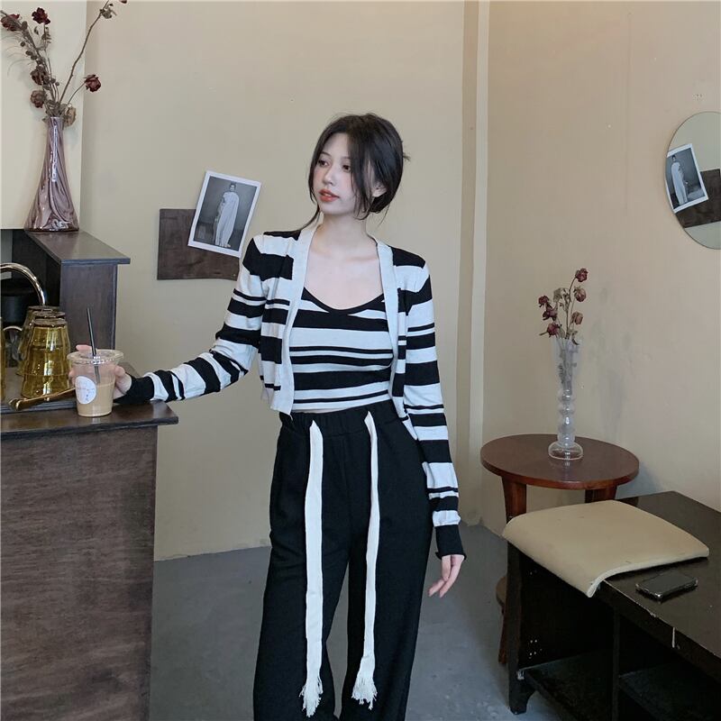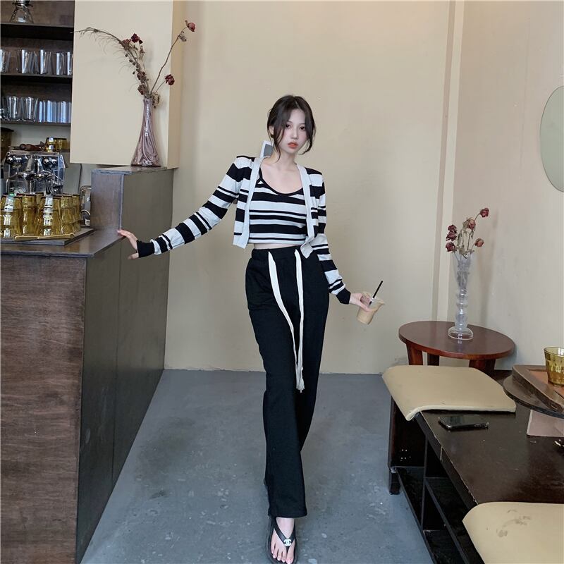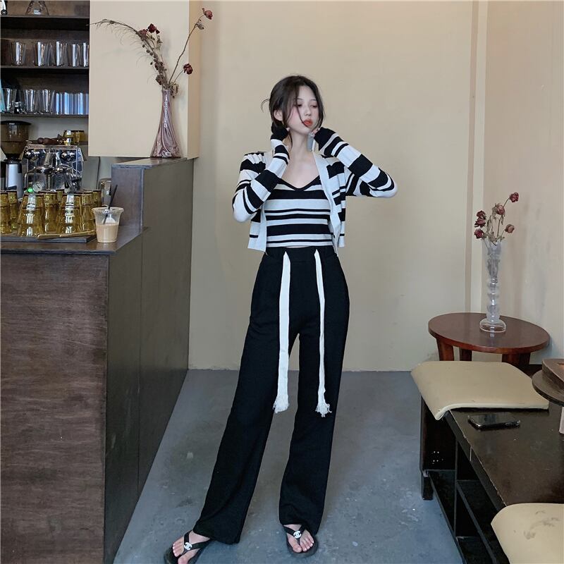 ストライプニットオータムカーディガンカジュアルハイウェストパンツ ロング 秋物 ガールズファッション39133035825
