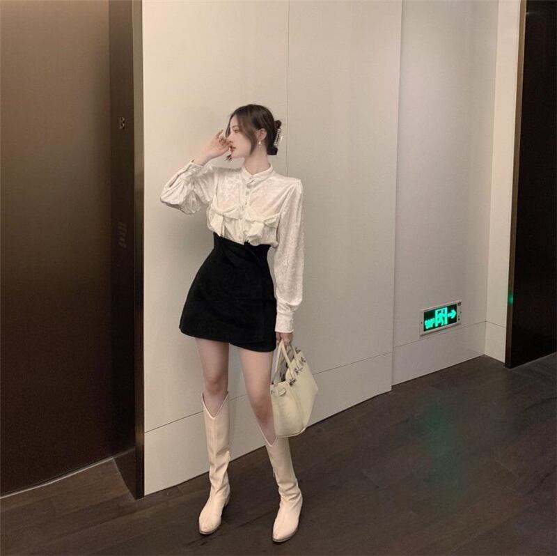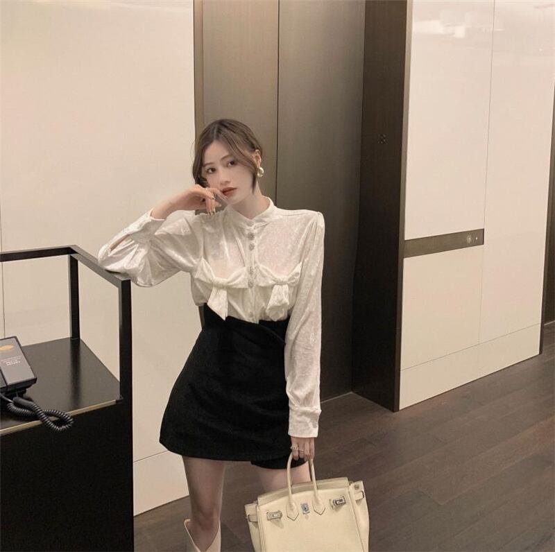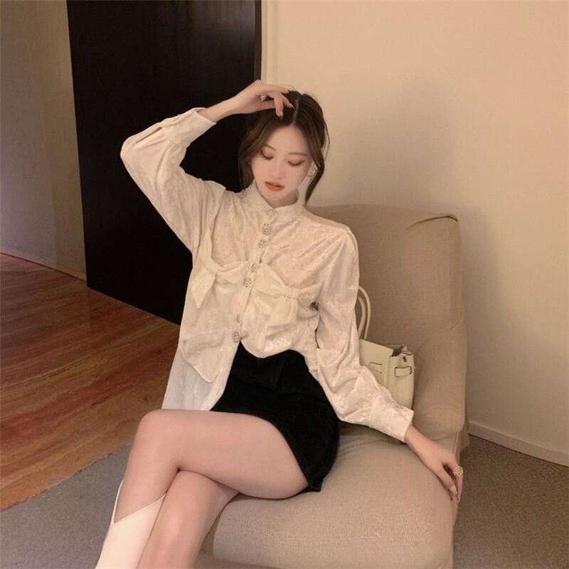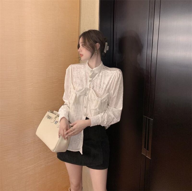 スタンダードスタイルベルベットホワイトシャツ オータムルーズトップス ロング レトロ 秋物 ガールズファッション57053971754