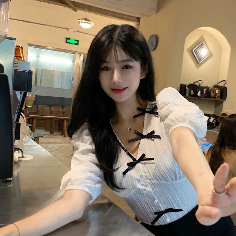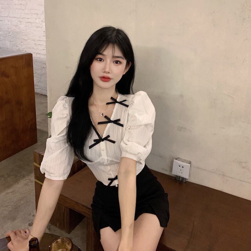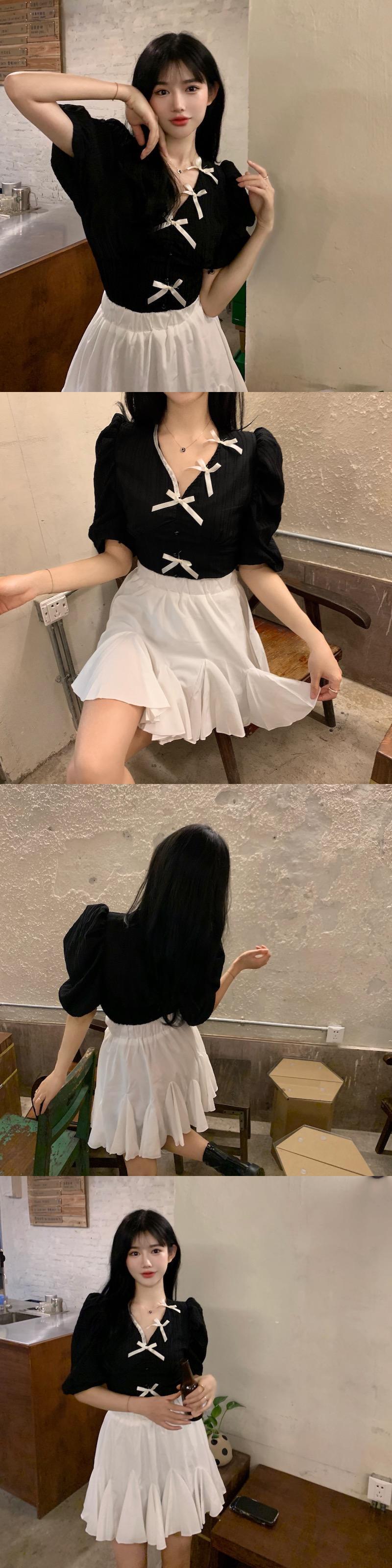カラースリーブTシャツ レディースサマーVネックウェスト薄手ショートトップス リボン 大人ガーリー スウィート キュート カジュアル 夏物 ガールズファッション14098135645