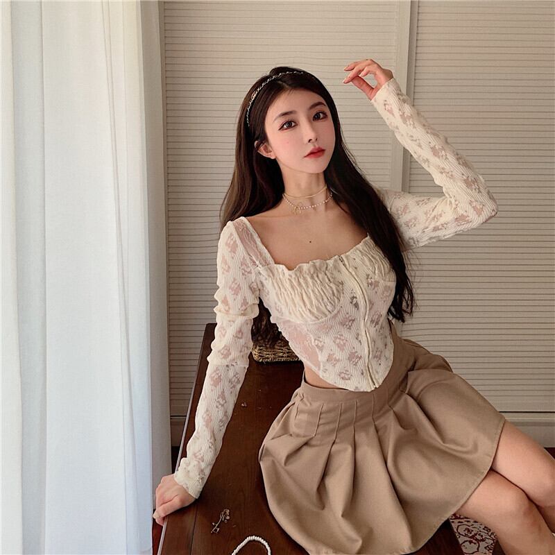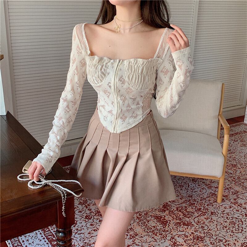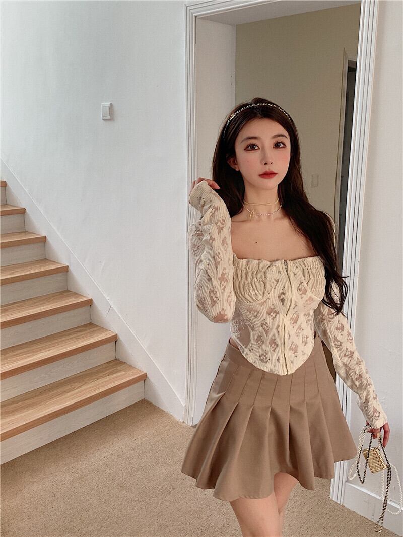 オータムレースショートトップス レディースウェストプリーツAラインスカート ストリート 秋物 ピュア スクウェア ガールズファッション50384339510