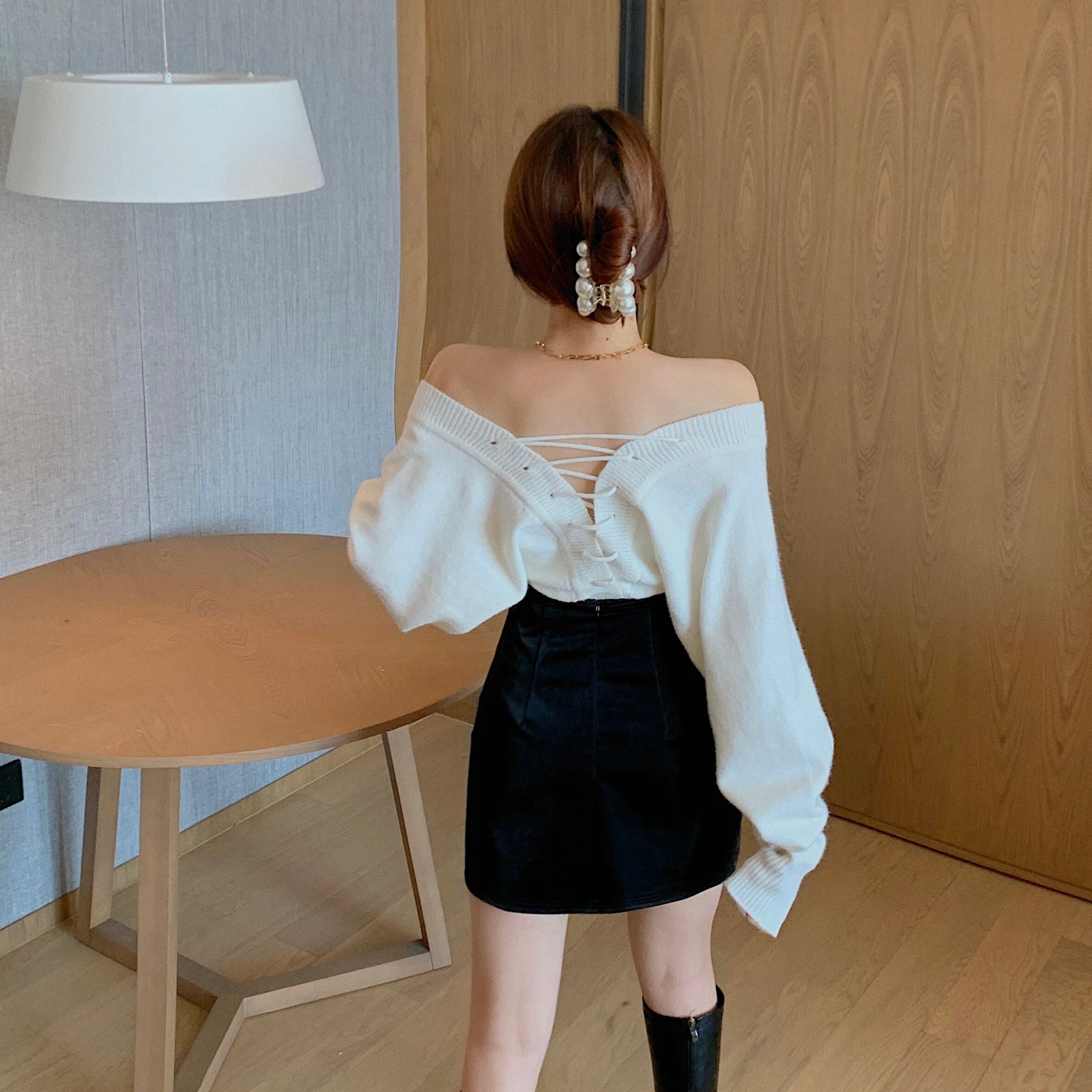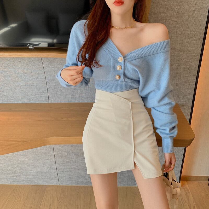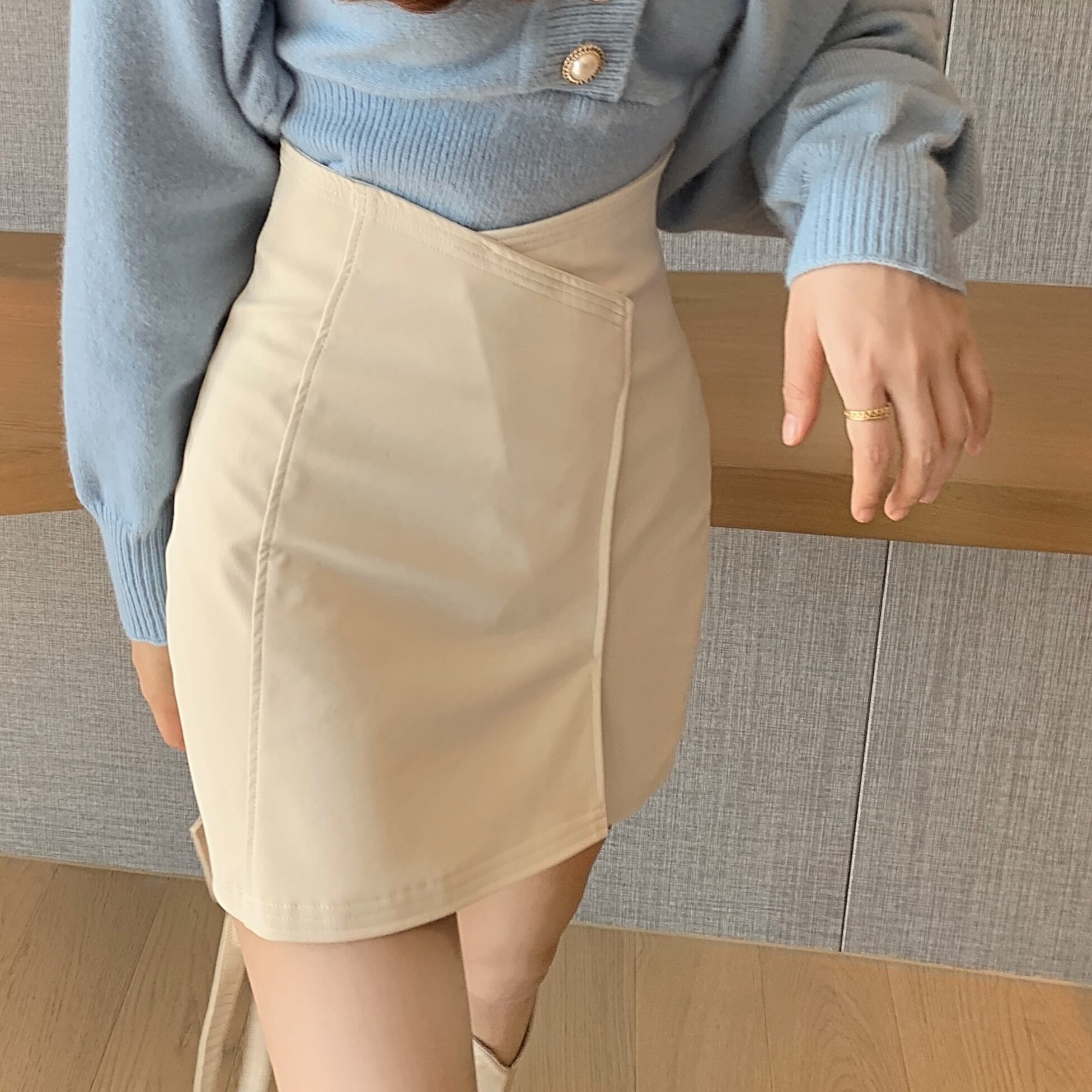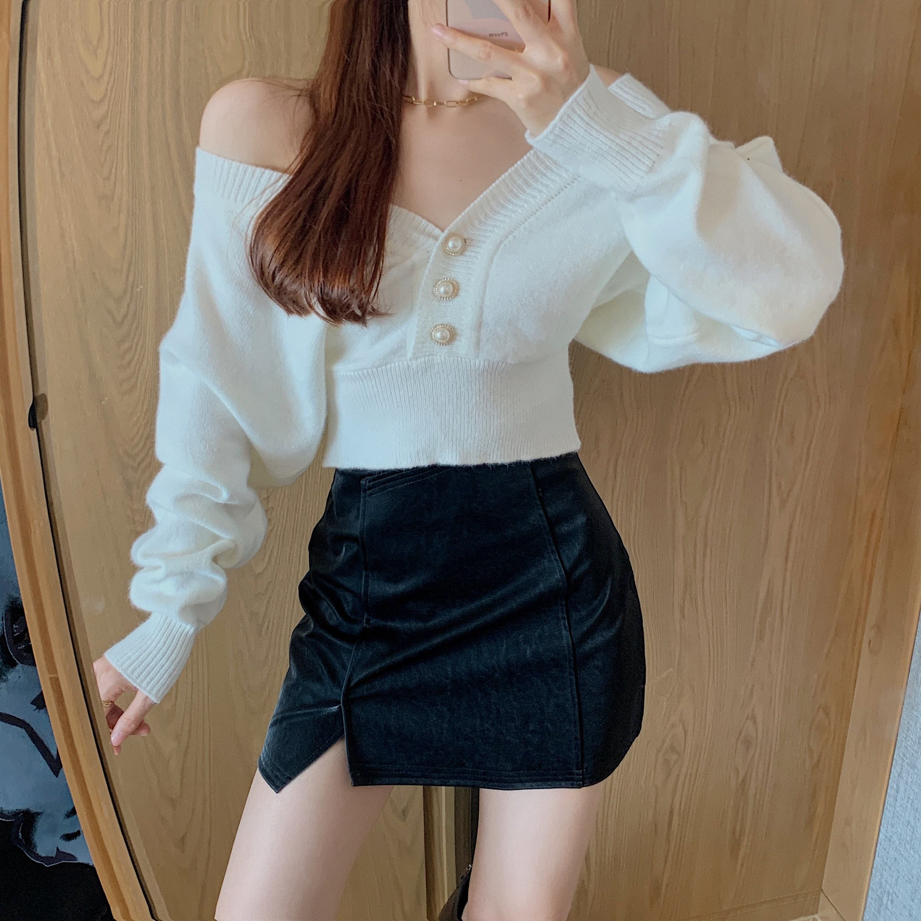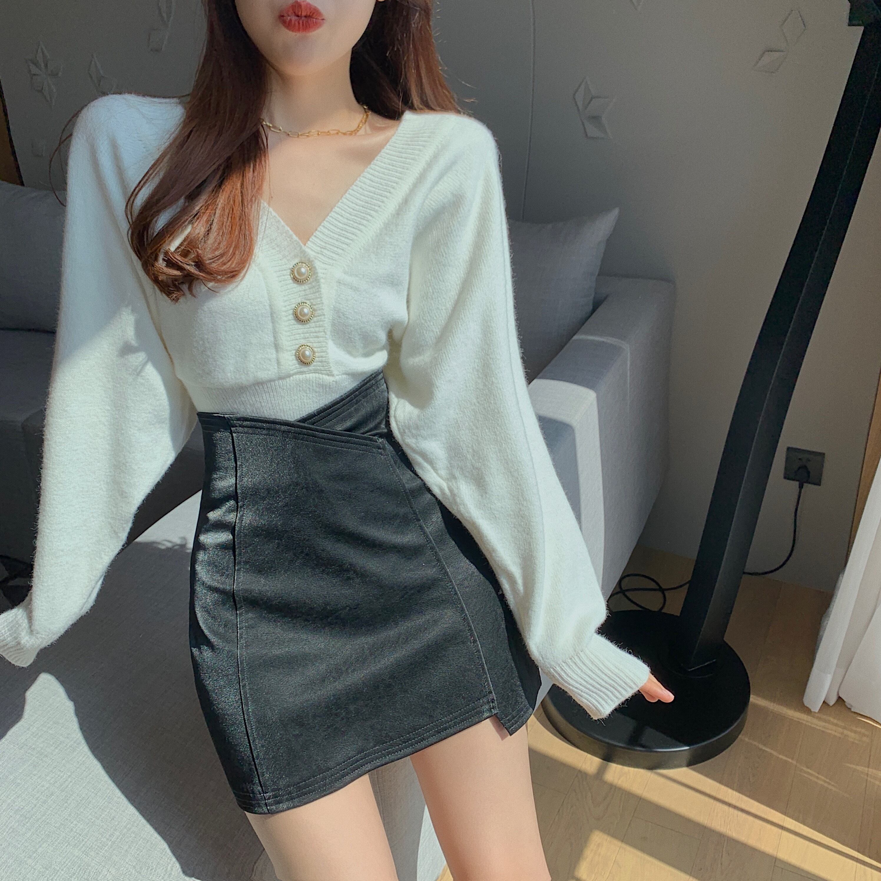 オータムウェストレザーショートスカート セーター レッド ストリート 秋物 Vネック ガールズファッション12607204728