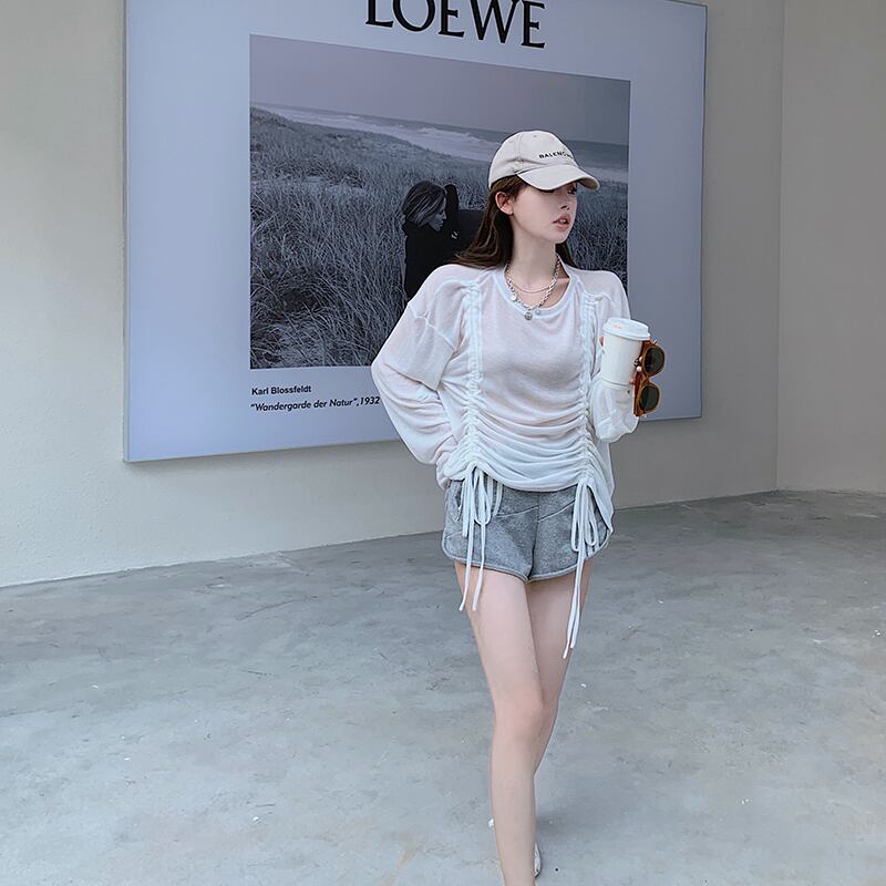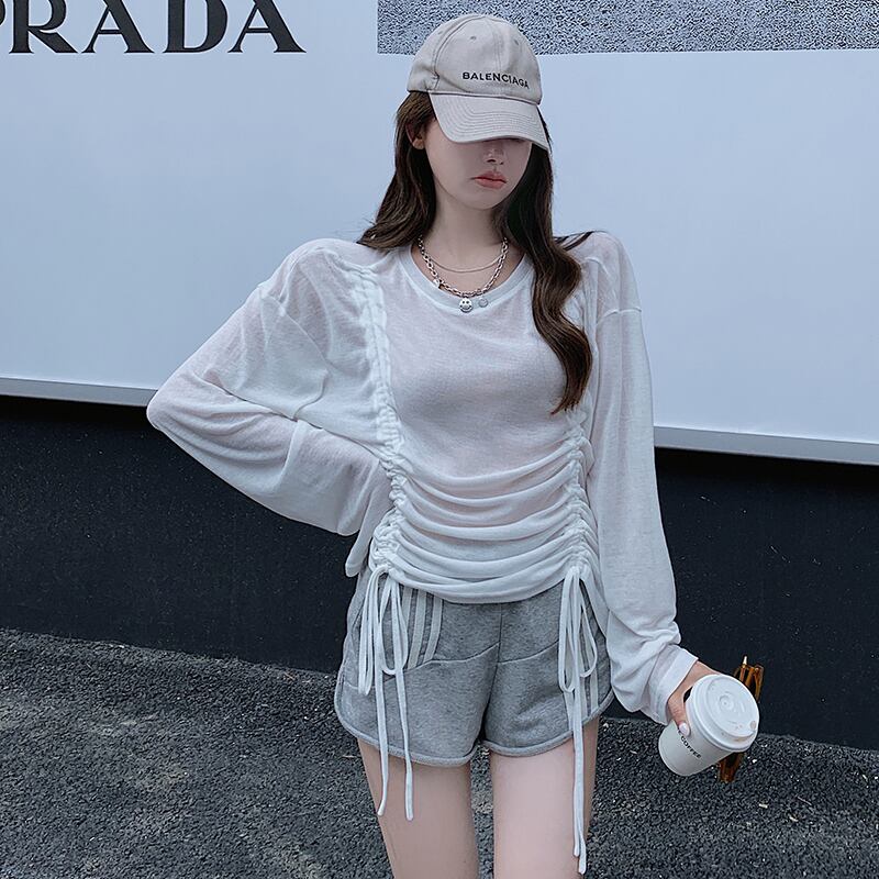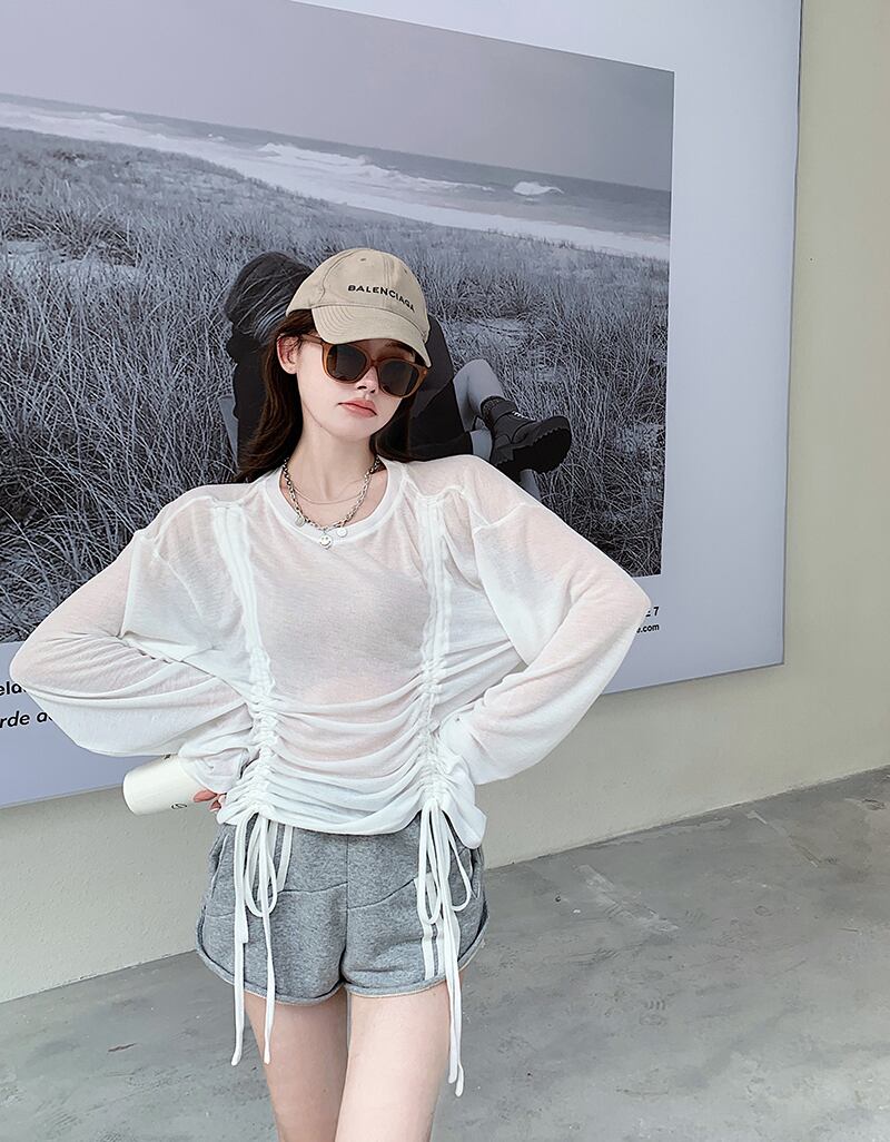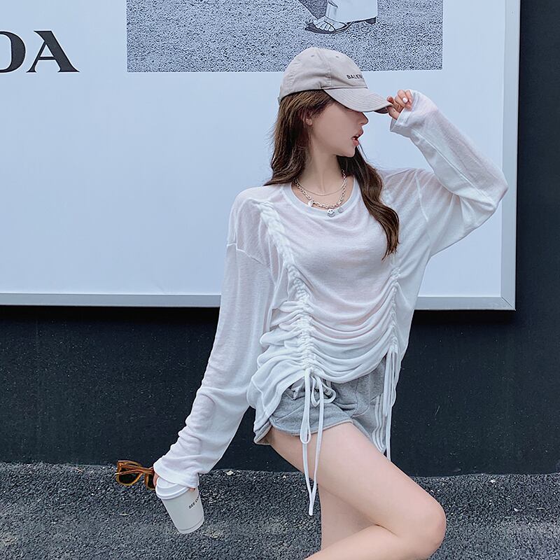薄手Tシャツ オータムギャザーブラウス ラウンドネックトップス ロング 秋物 Oネック ガールズファッション75200191817