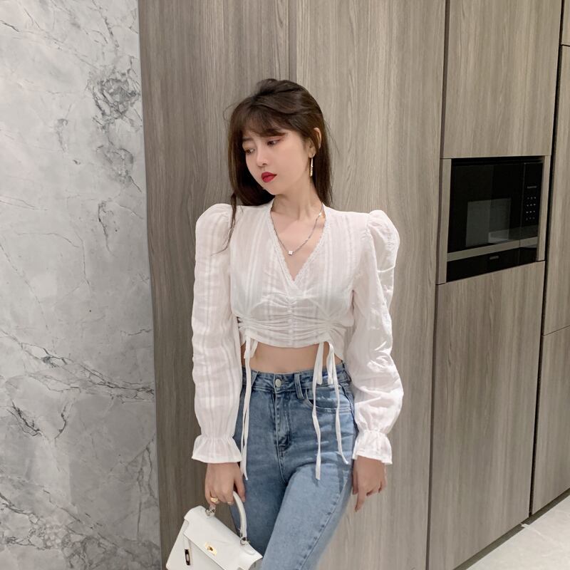 ギャザーVネックショートシャツ オータム薄手スリムトップス ロング 秋物 ガールズファッション14724449444