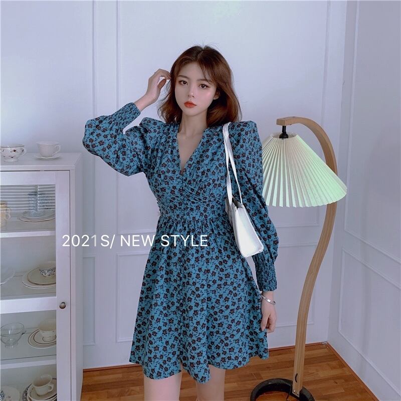 スタイルスタンダードVネックスリーブブルーフローラルスカート オータムウェストドレス Aライン レトロ 大人ガーリー スウィート キュート カジュアル 秋物 花柄 ガールズファッション45404228111