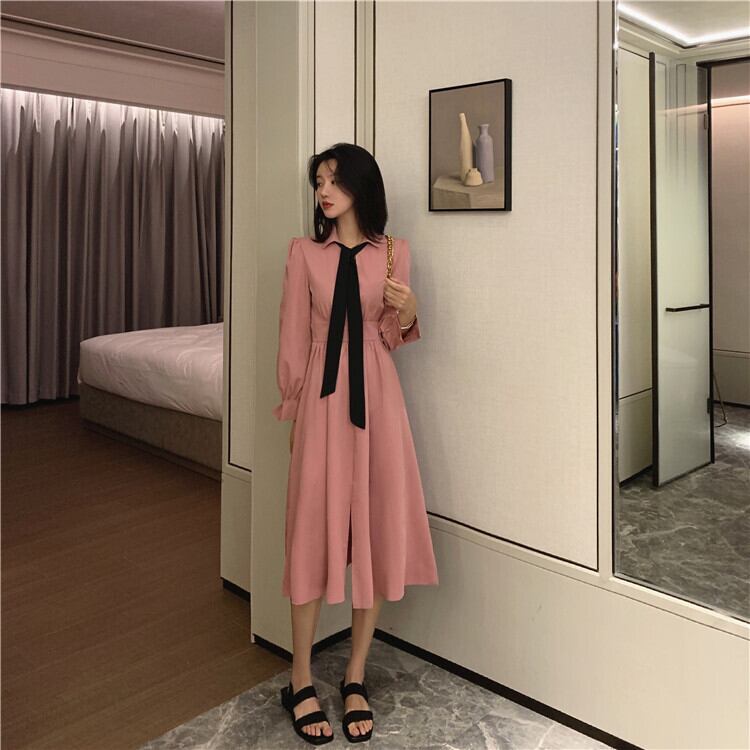 カラーAラインスカート オータムスタイルウェストドレス ロング ピンク 大人ガーリー スウィート キュート カジュアル 秋物 ガールズファッション60706352309