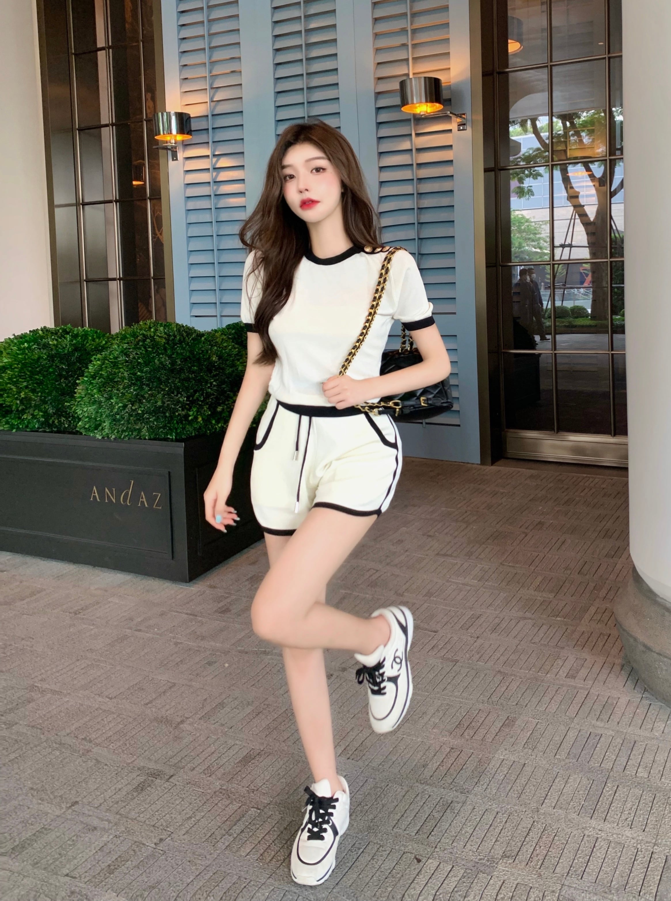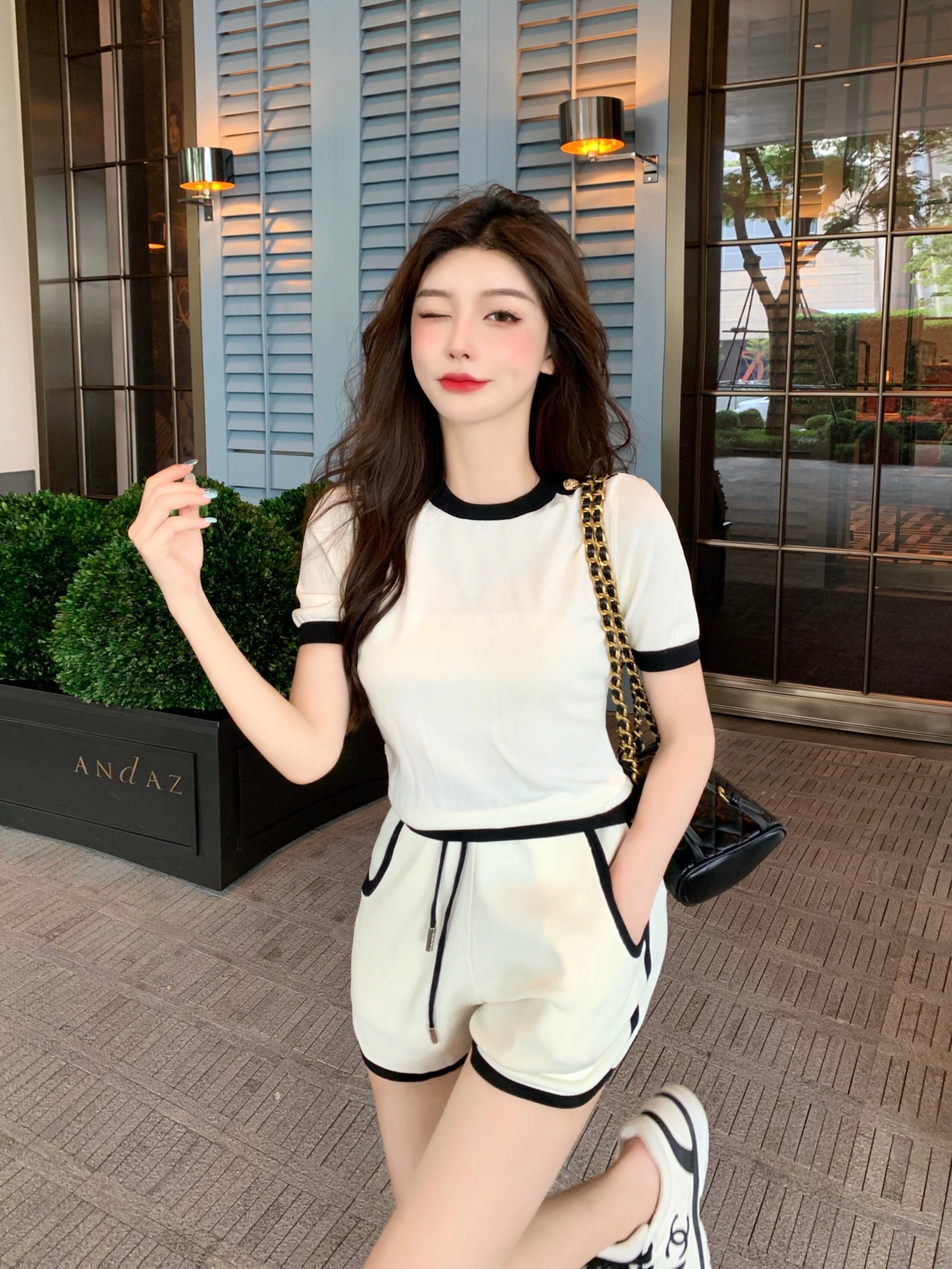 サマースタンダードラウンドネックスリムショートトップス カラーハイウェストギャザーショーツ レトロ 夏物 ブルマー Oネック ガールズファッション65999591613