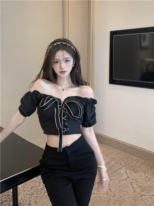 シャツ サマーショートトップス スリーブリボンブラック 大人ガーリー スウィート キュート カジュアル 夏物 ガールズファッション17640084477