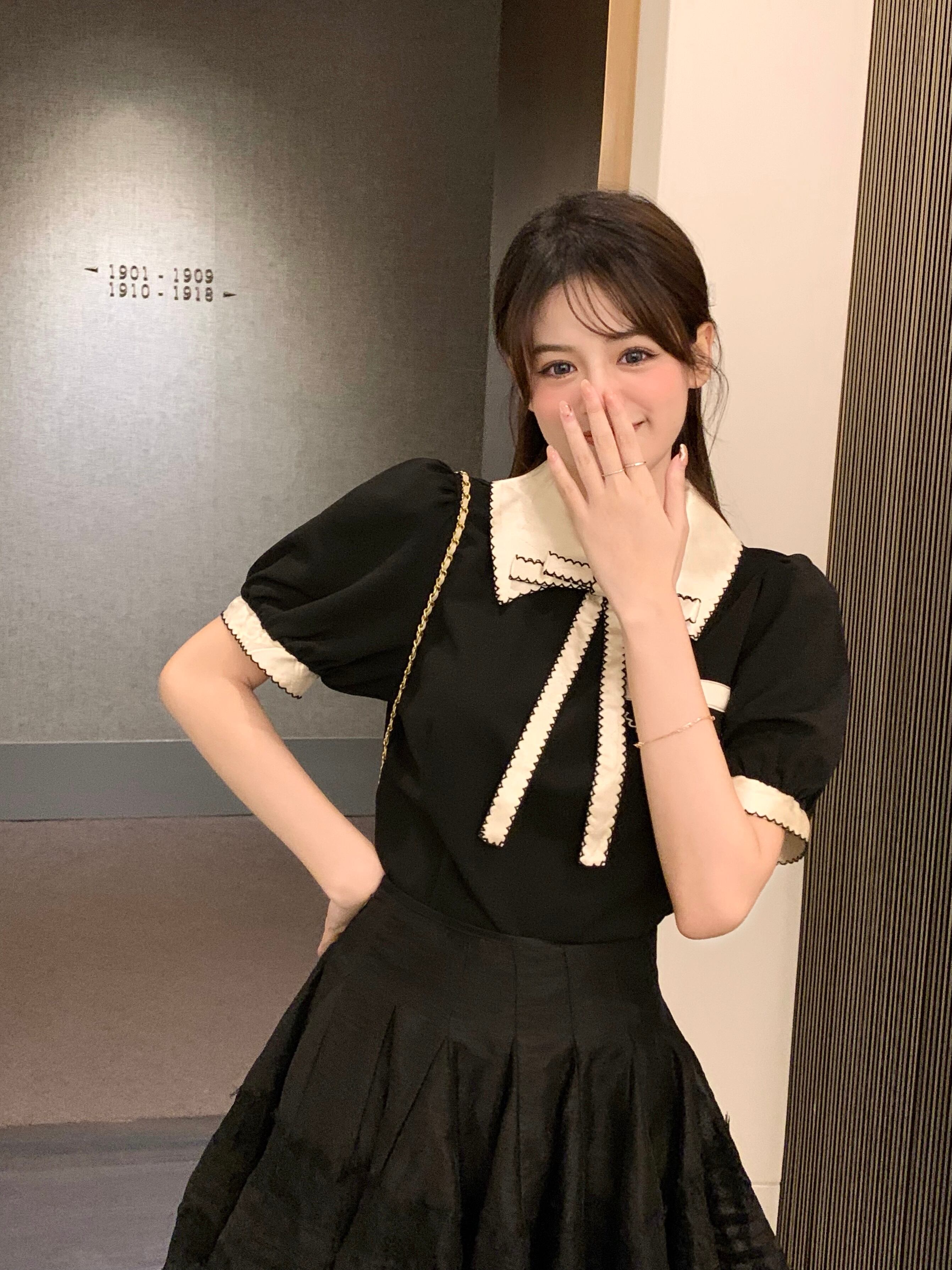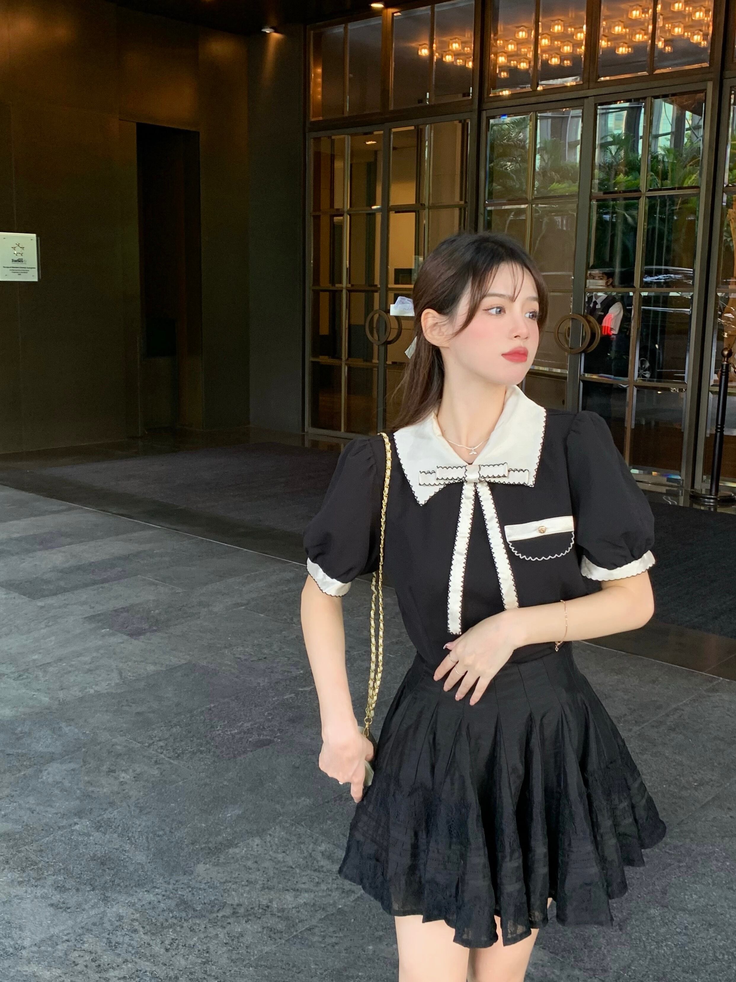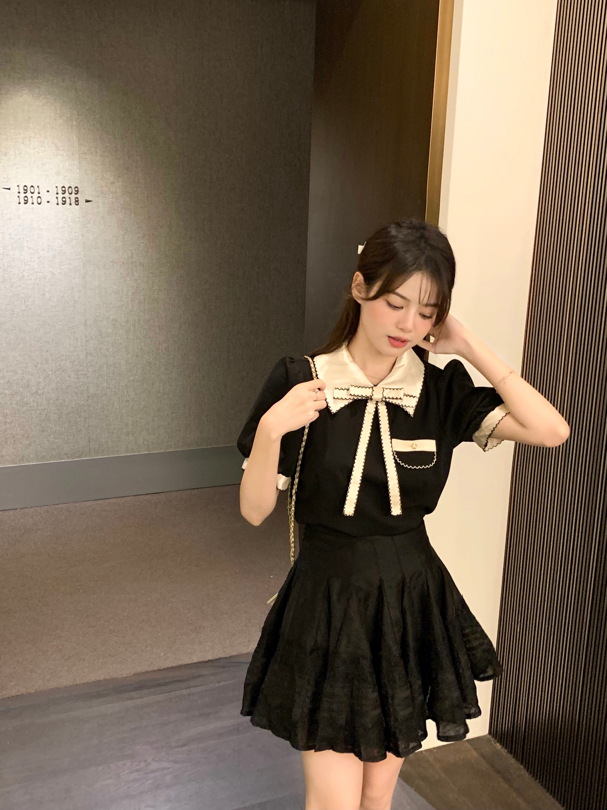 カラーリボンショートトップス スタンダードレースAラインスカート オータム レトロ ストリート 秋物 ステッチ ガールズファッション87213489269