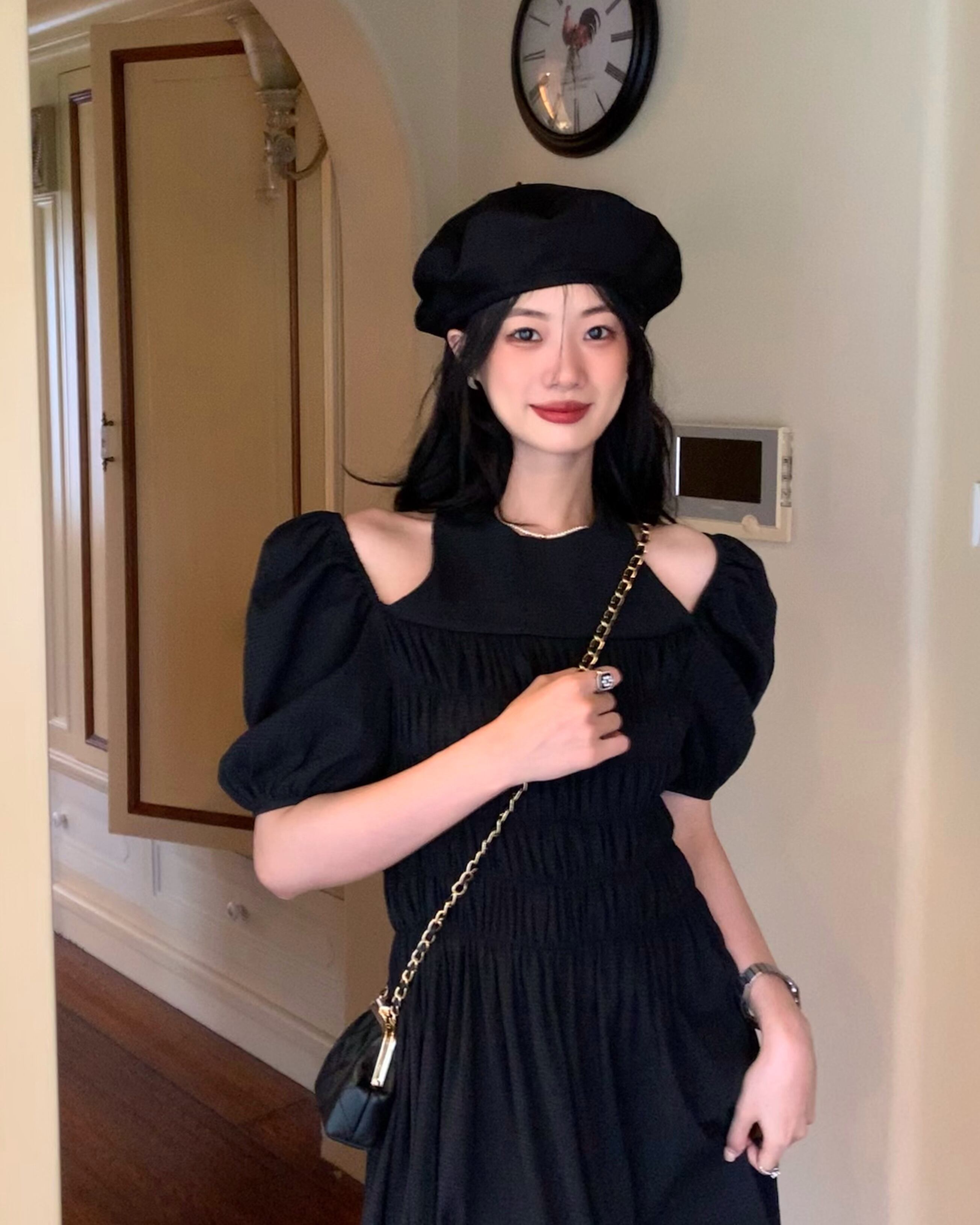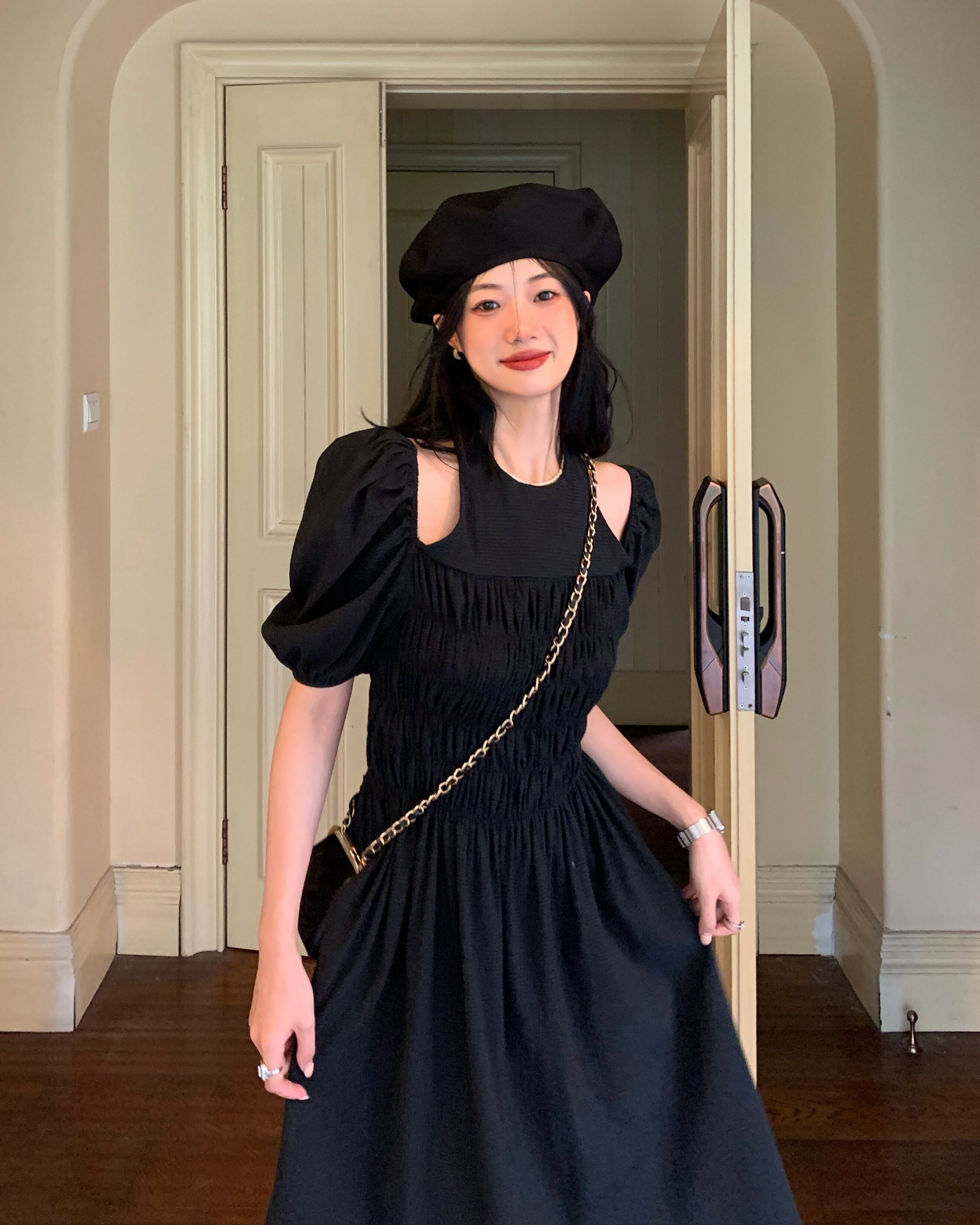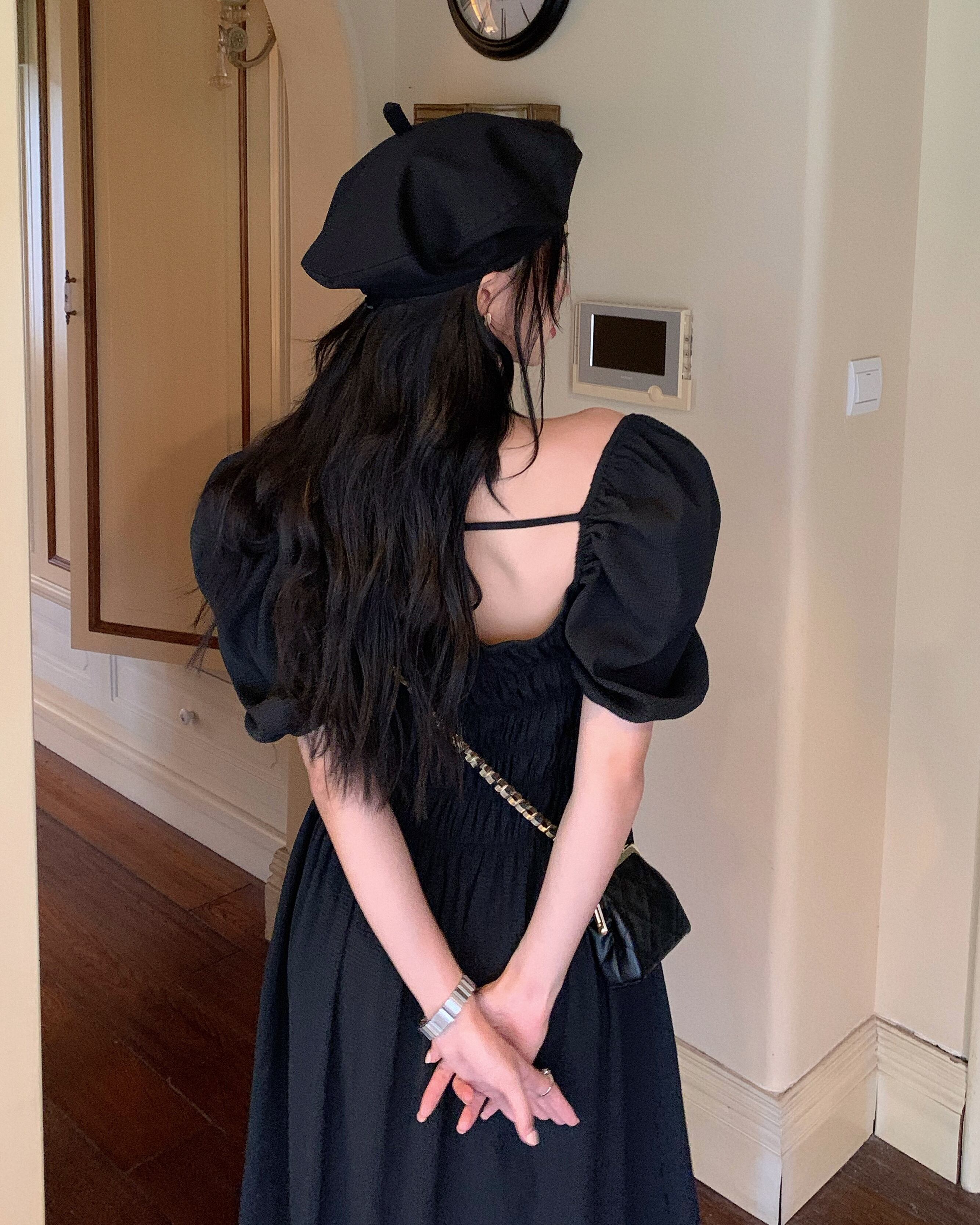ブラックドレス サマースタンダードウェストスリーブスカート レトロ 夏物 ガールズファッション76139486499
