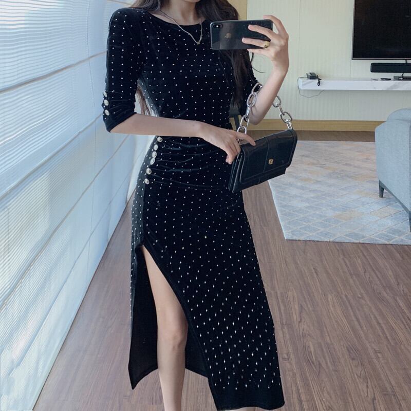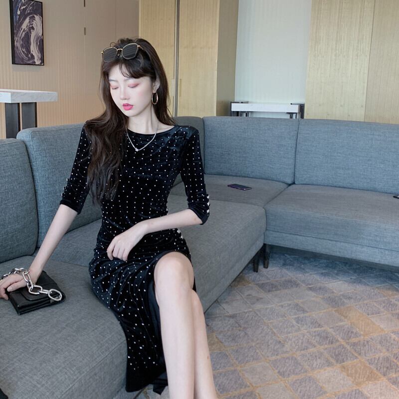 スタンダードベルベットスリットスカート オータムスタイルウェストドレス レトロ 秋物 ガールズファッション70481623251
