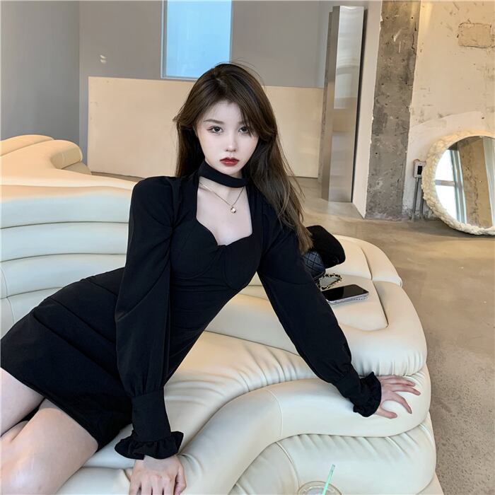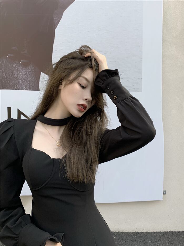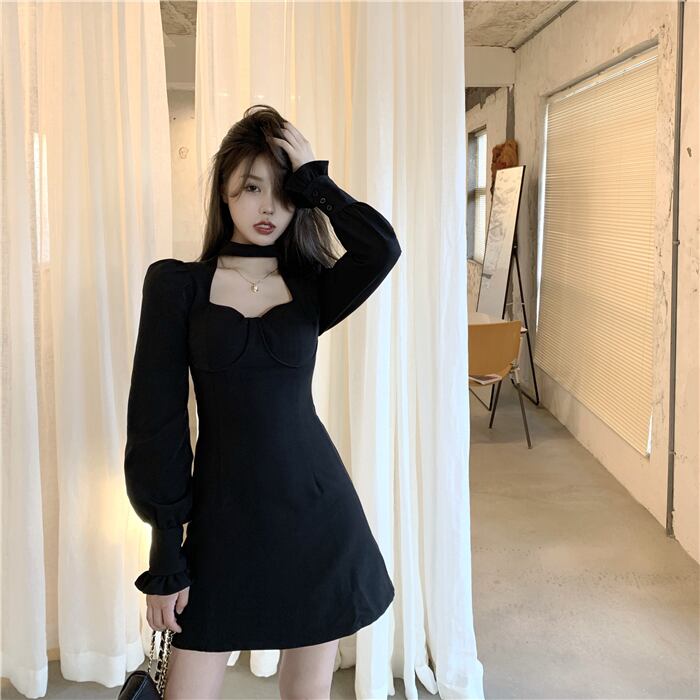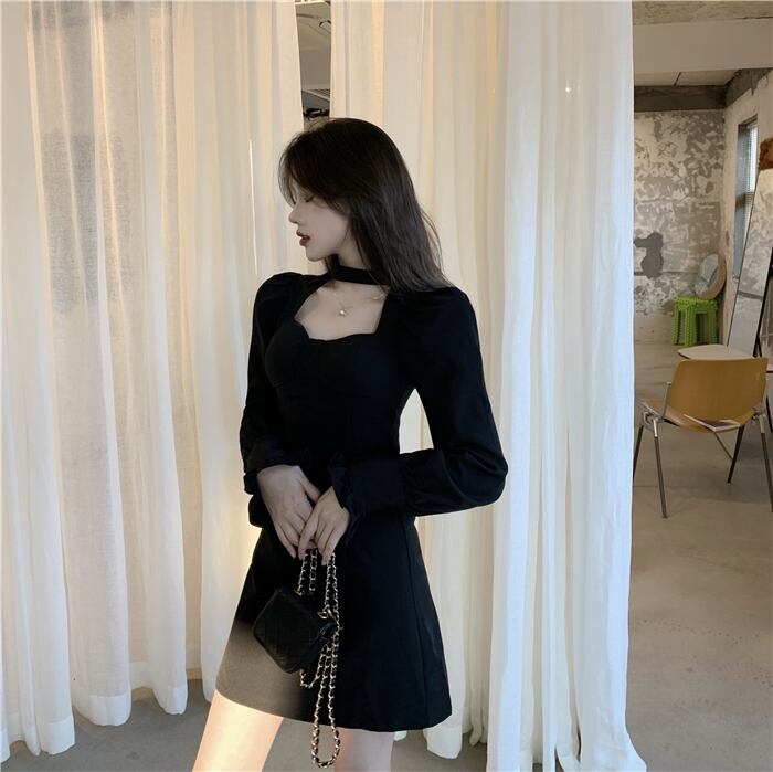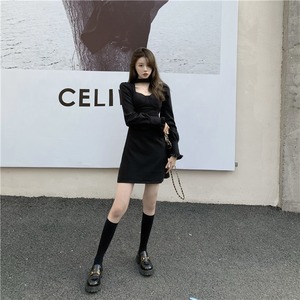 スリーブドレス オータムブラックハイウェストウェスト薄手Aラインスカート 大人ガーリー スウィート キュート カジュアル 秋物 ガールズファッション97422194224