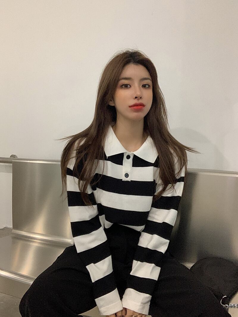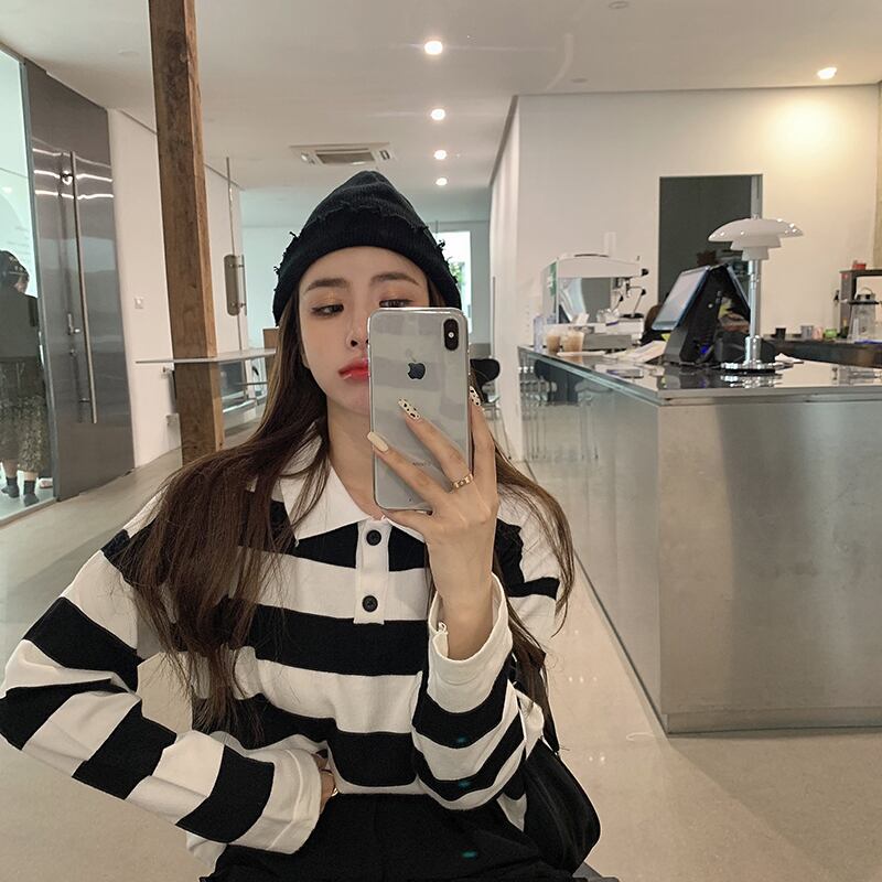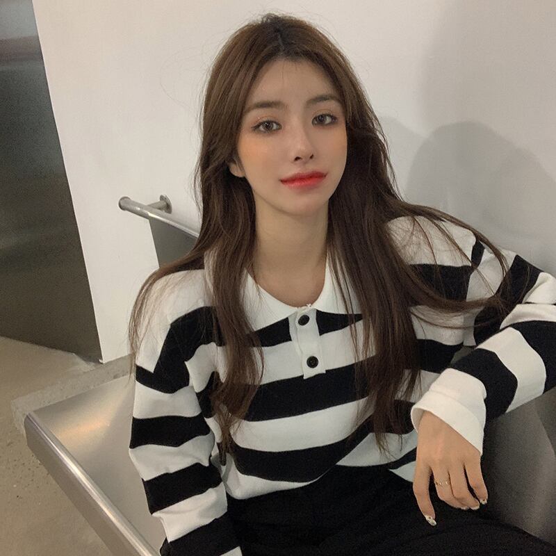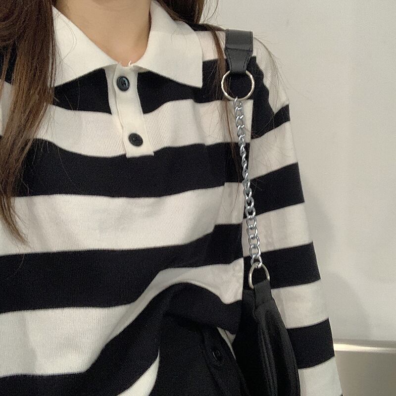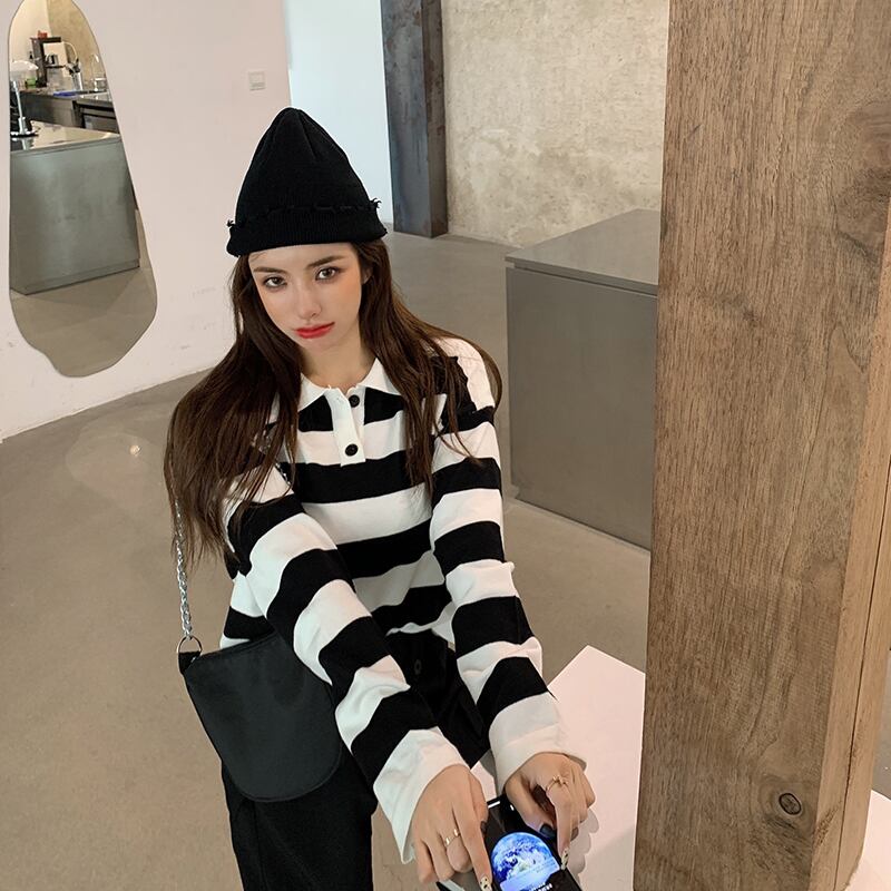 カラーブラックホワイトストライプセーター オータムスタンダードトップス ロング レトロ 秋物 ガールズファッション654252702