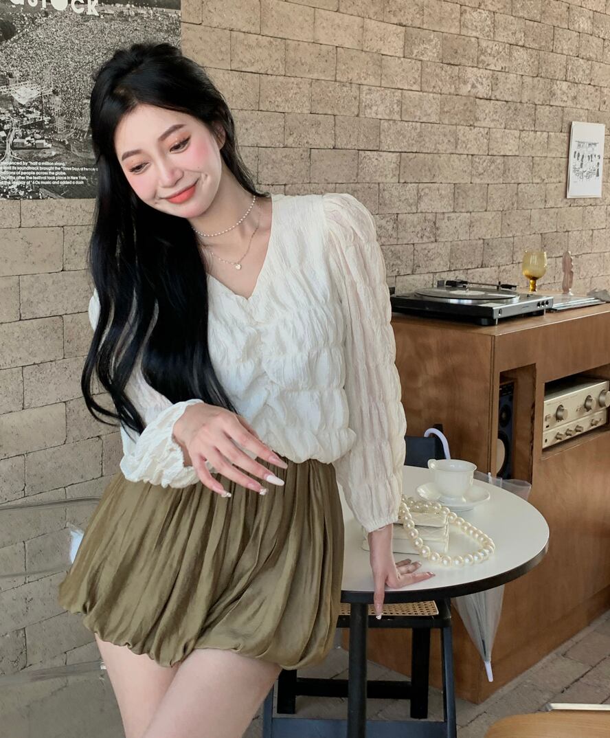 オータムVネック薄手シャツ ハイウェストショートスカート ストリート 秋物 ガールズファッション79198876827