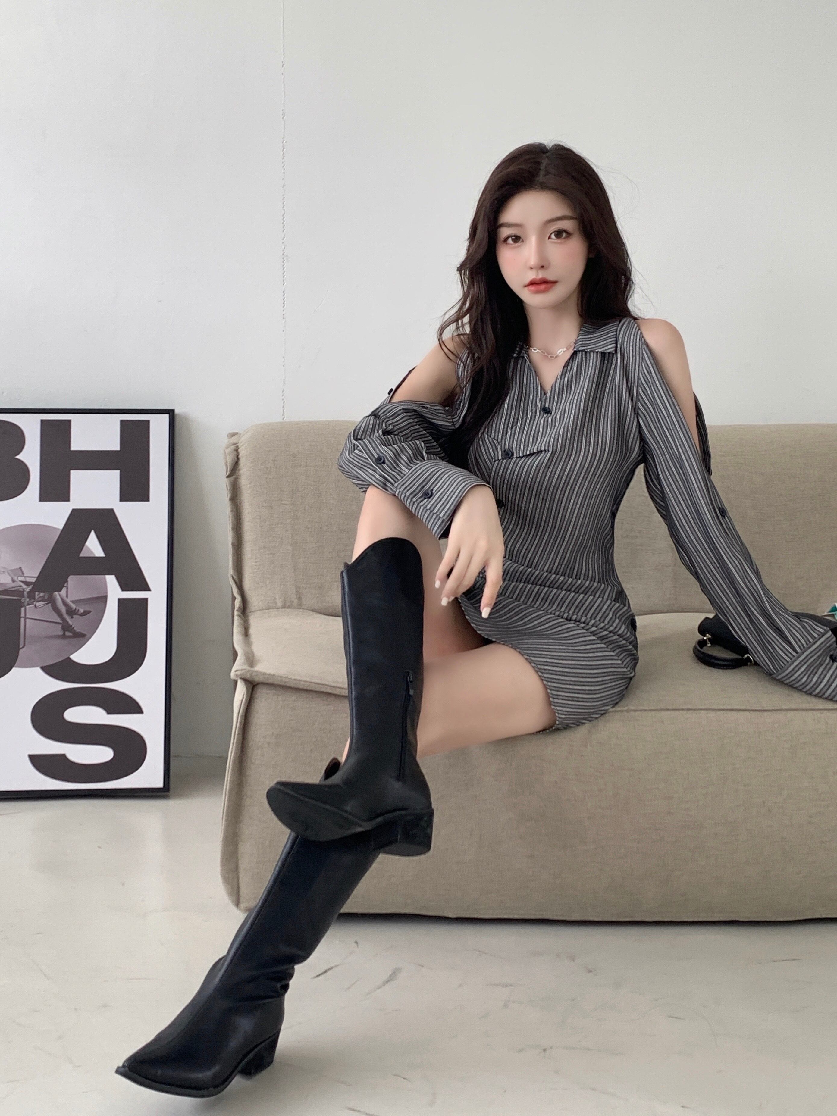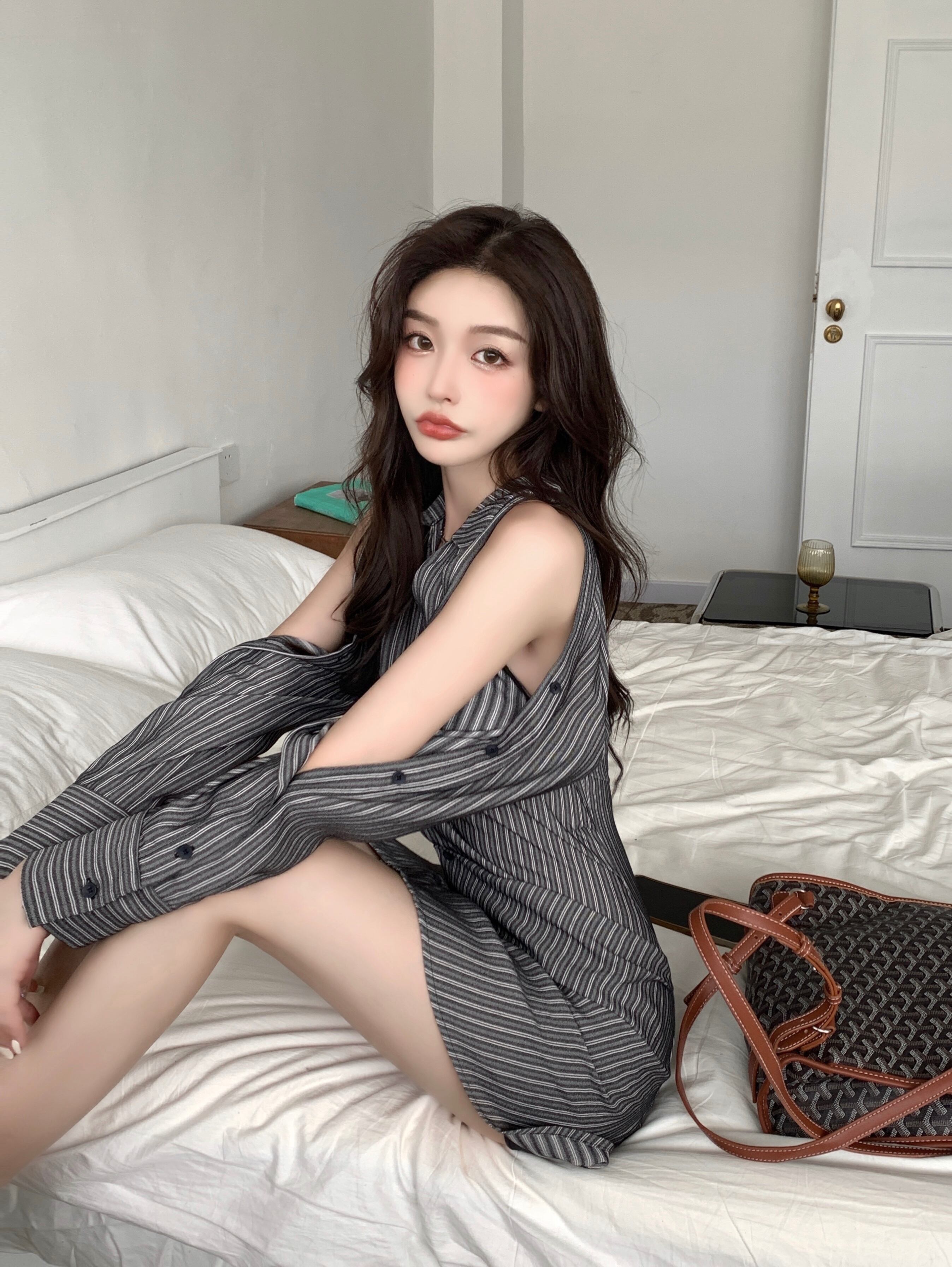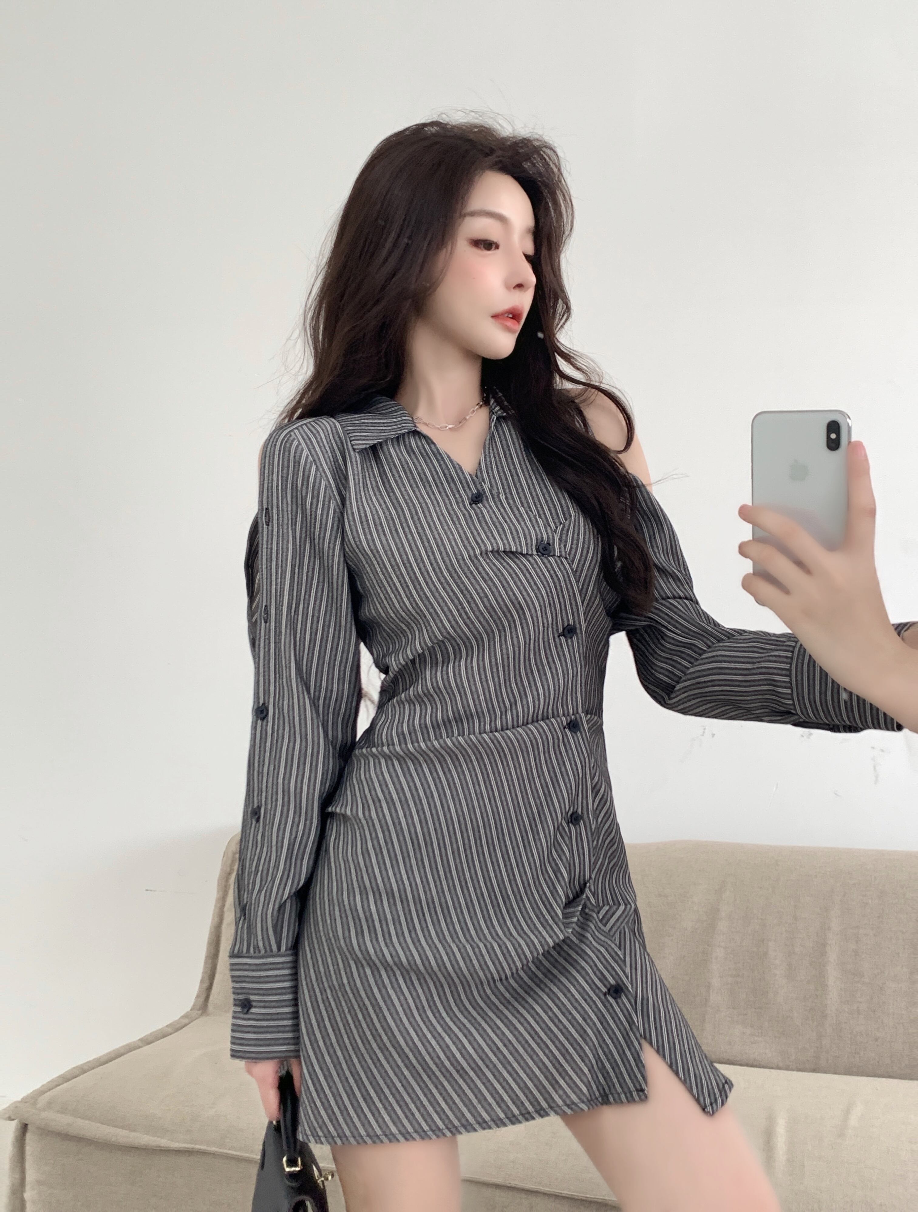 ストライプシャツ ドレス オータムストラップレスウェストショートスカート 秋物 ガールズファッション67250453612