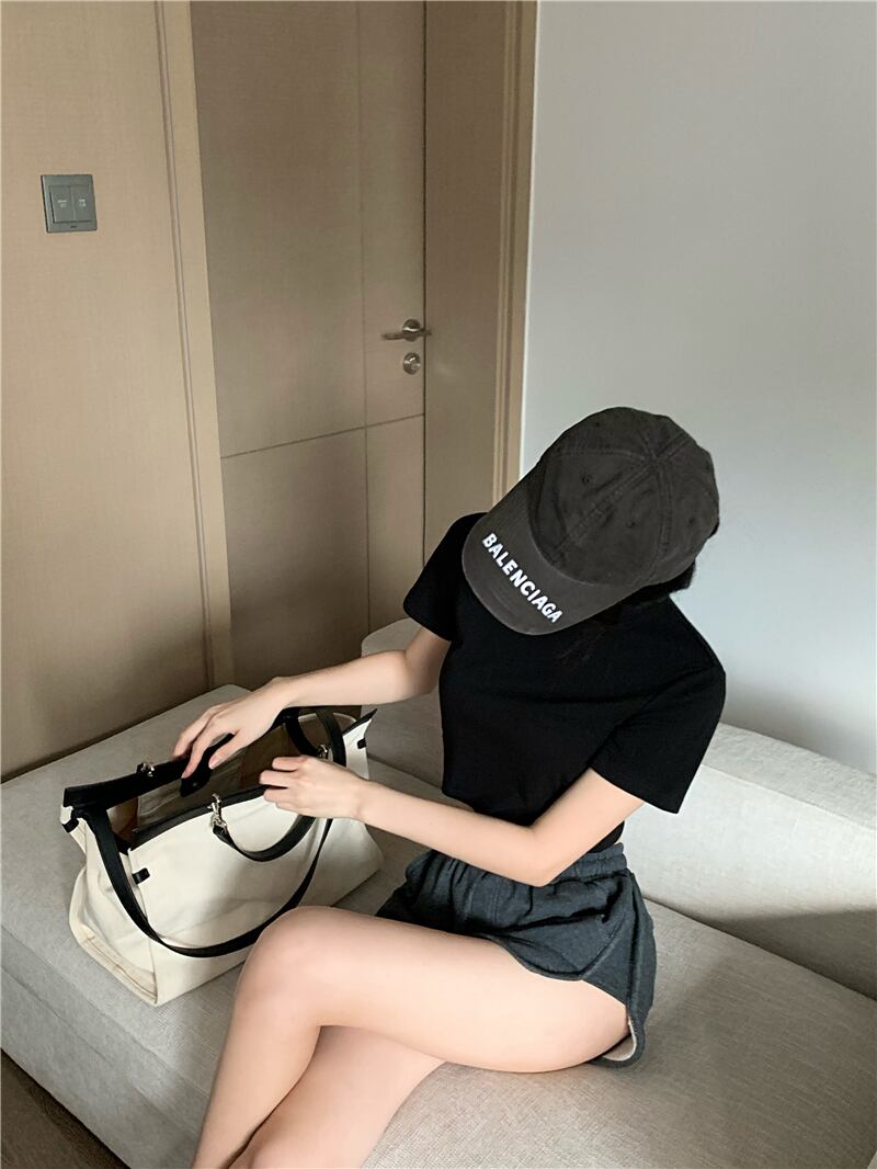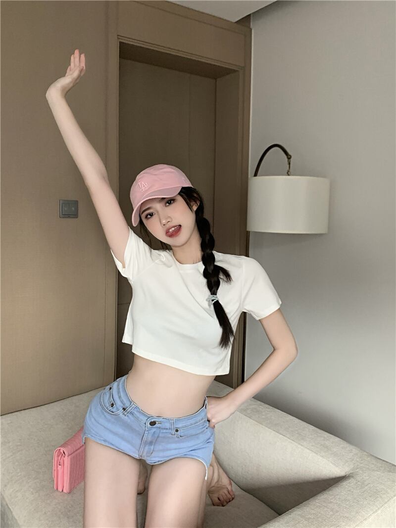 スタンダードラウンドネックショートトップス サマーカジュアルスリムブラックTシャツ レトロ 夏物 Oネック ガールズファッション61332548554