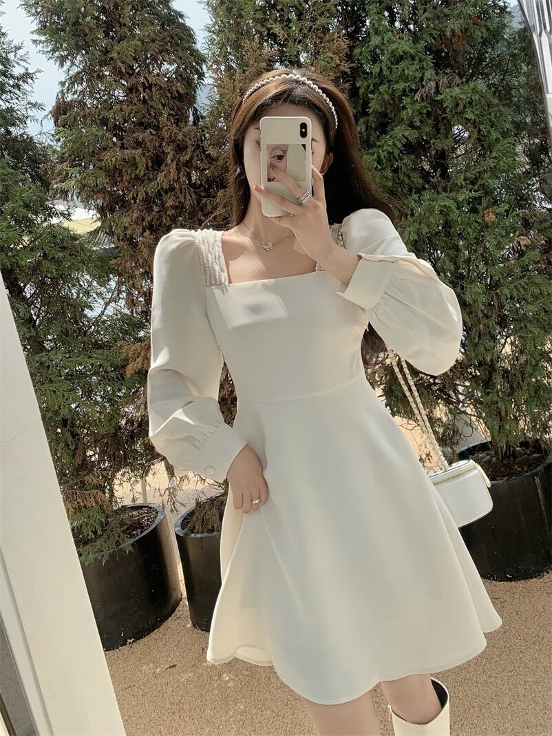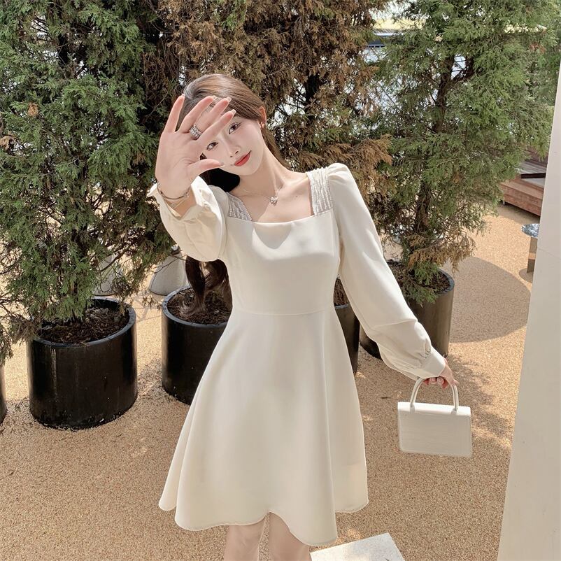 ホワイトドレス オータムスタイルウェストAラインショートスカート カラー 大人ガーリー スウィート キュート カジュアル 秋物 スクウェア ガールズファッション84938058728
