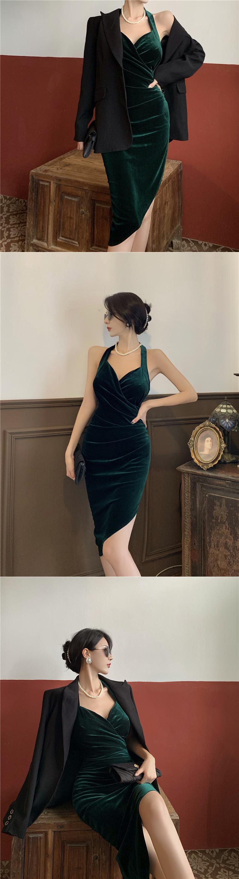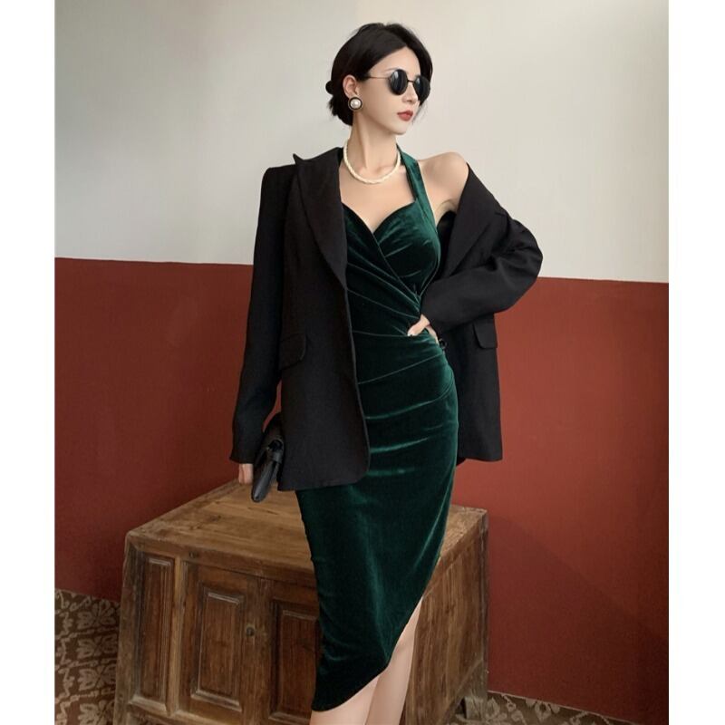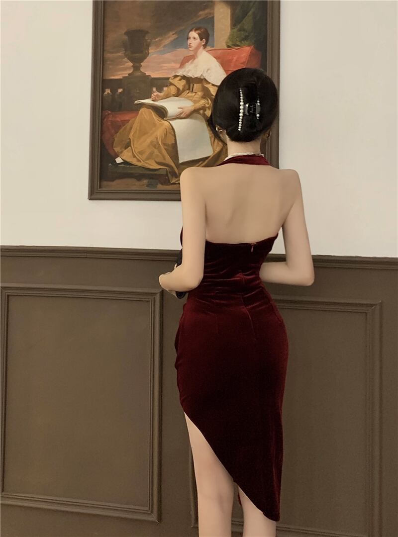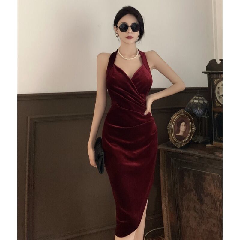 スタンダードスカート オータムスタイルベルベットウェストVネックドレス レトロ 秋物 ガールズファッション516257501