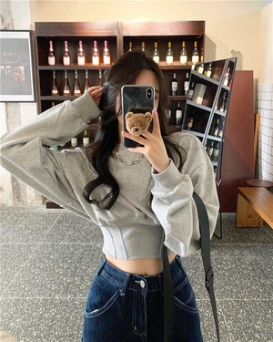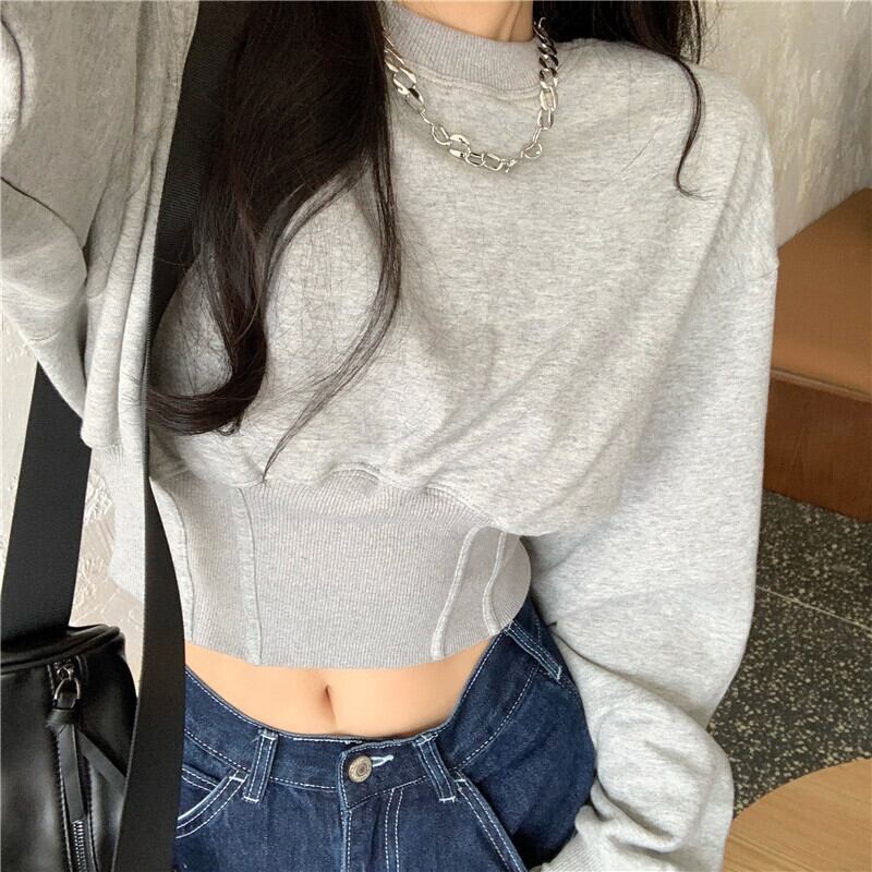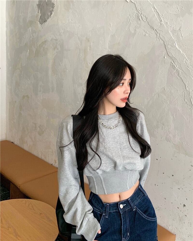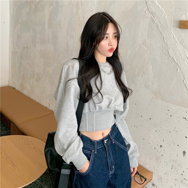 ラウンドネックソリッド カラープルオーバー セーター オータムスタイルショートウェスト長袖スリーブシャツ ロング 秋物 Oネック ソリッドカラー ガールズファッション4734516428