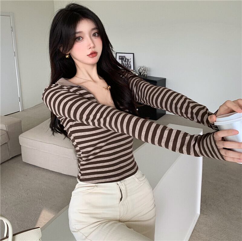 スタンダードストライプTシャツ シャツ オータムウィンターショートスタイルスリムトップス ロング レトロ 秋物 冬物 ガールズファッション71530788062