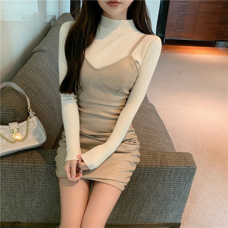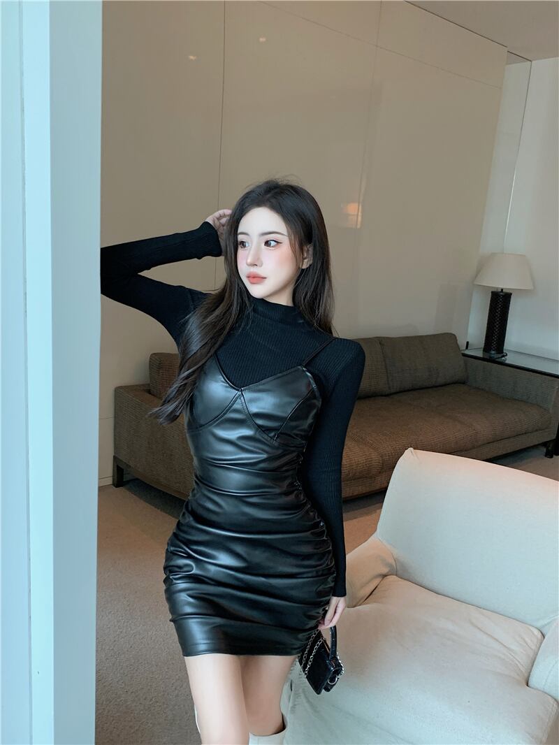 レディースオータムウィンターセーター ウェストレザードレス ロング ストリート 秋物 冬物 ガールズファッション73459076113