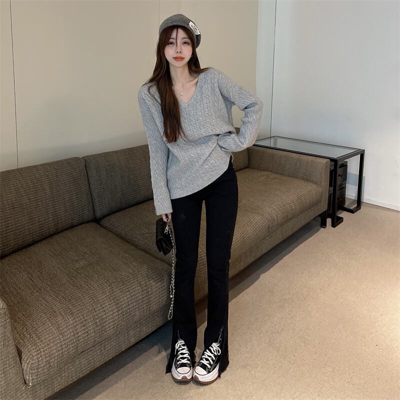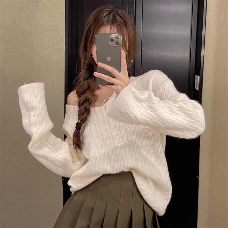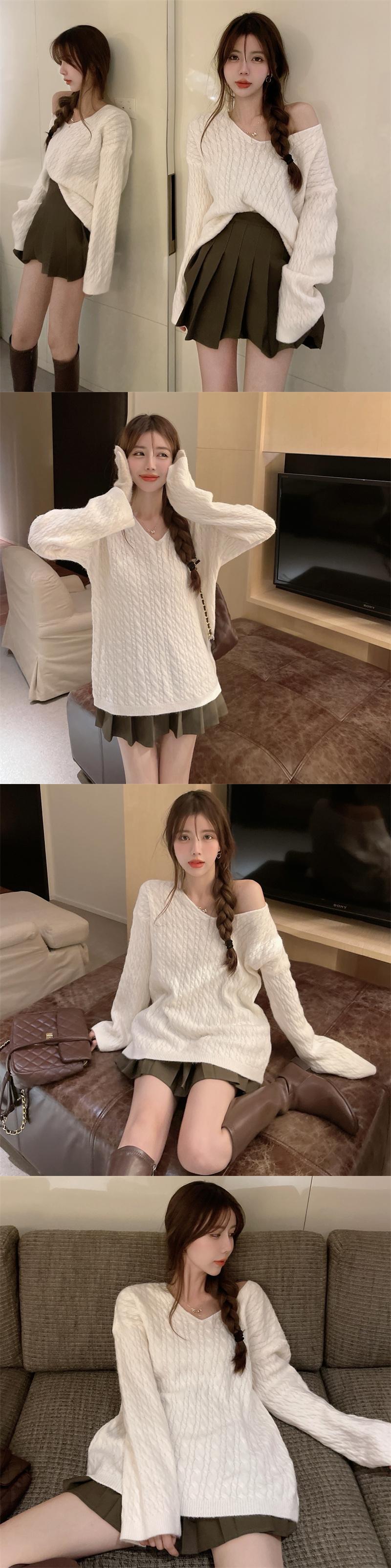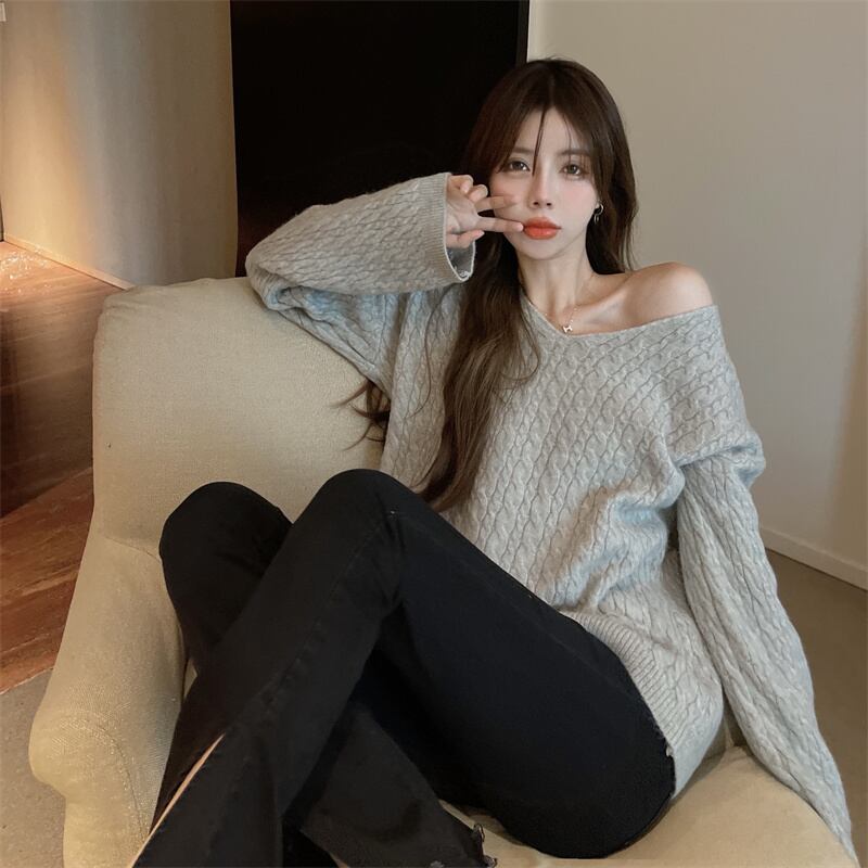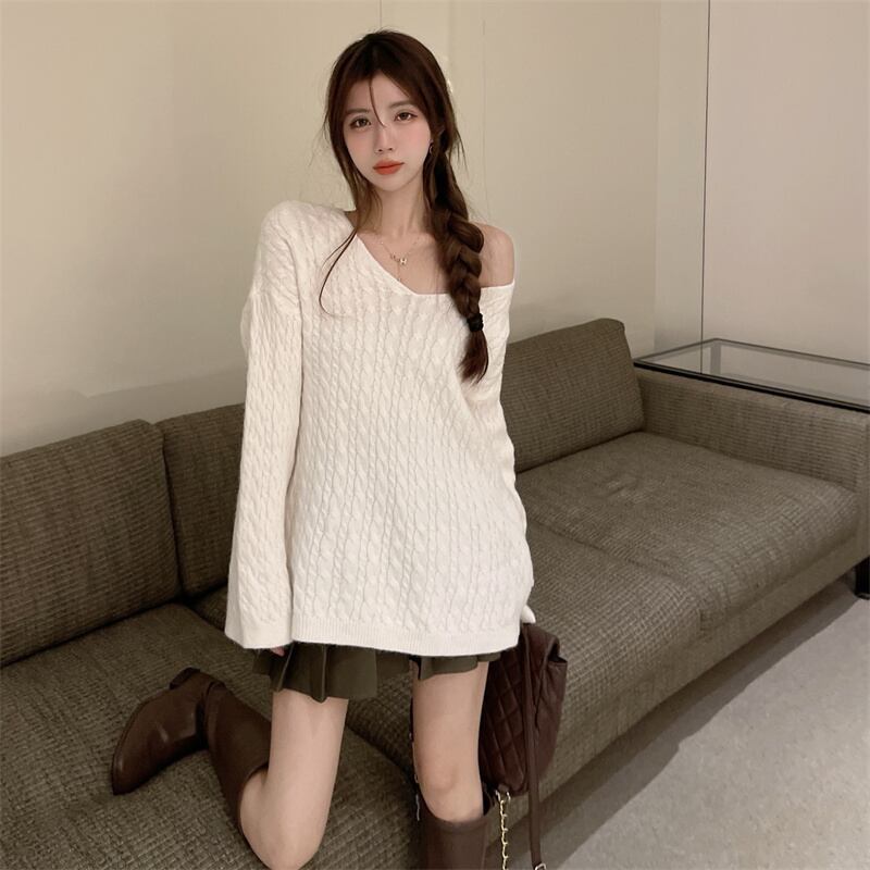 ルーズVネックプルオーバー ニットセーター レディースオータムウィンタースタイルスタンダードシャツ ロング レトロ 秋物 冬物 ガールズファッション71244170125