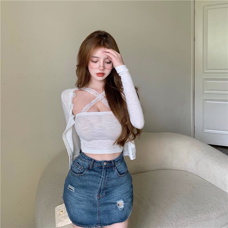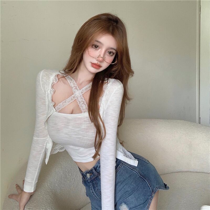 オータムウィンターショートクロップドソリッド カラー レース 秋物 冬物 ピュア ソリッドカラー ガールズファッション36574940093