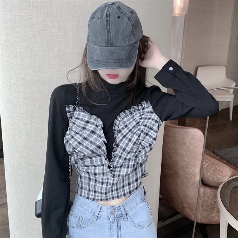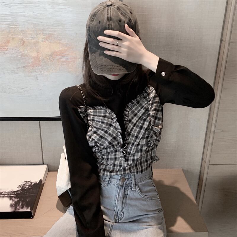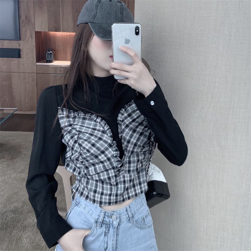 格子柄シャツ レディースオータムウィンターショートスリムラウンドネック長袖スリーブシャツ ロング 秋物 冬物 Oネック ステッチ ガールズファッション93836274097