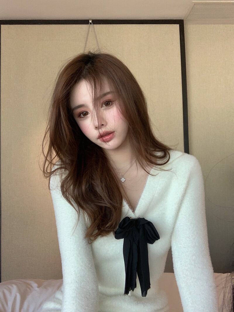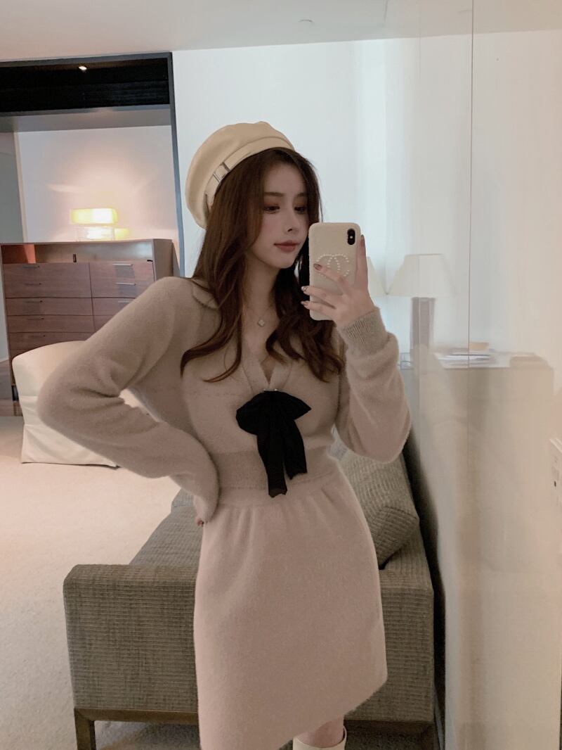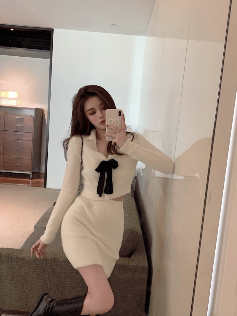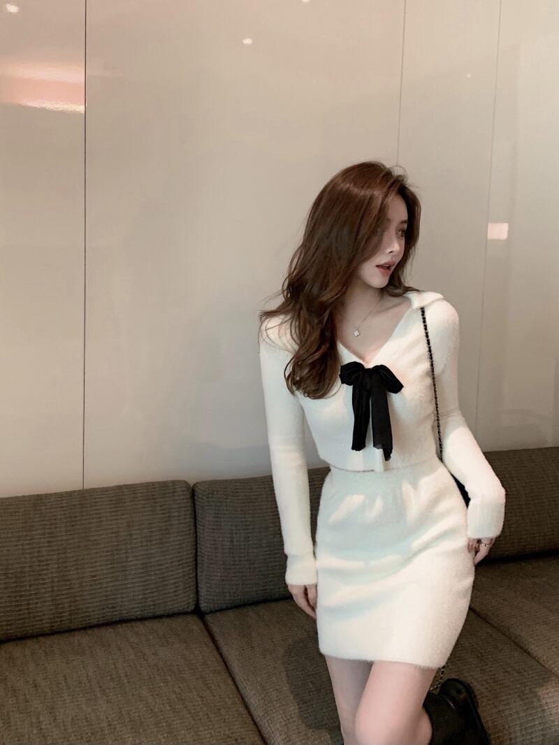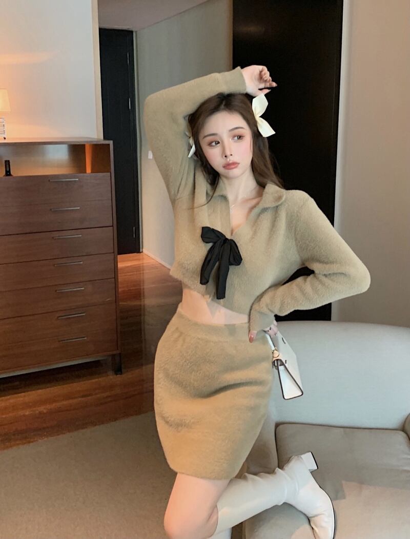 スタイルオータムウィンターショートVネックリボンセーター ハイウェストウェストスカート ロング 大人ガーリー スウィート キュート カジュアル 秋物 冬物 ガールズファッション5686808652