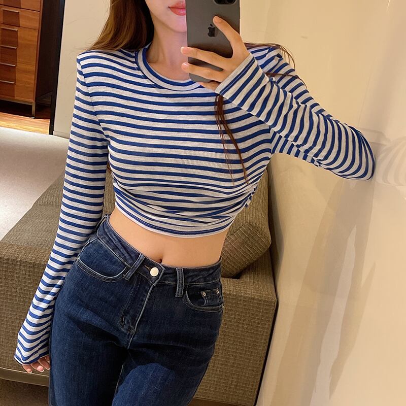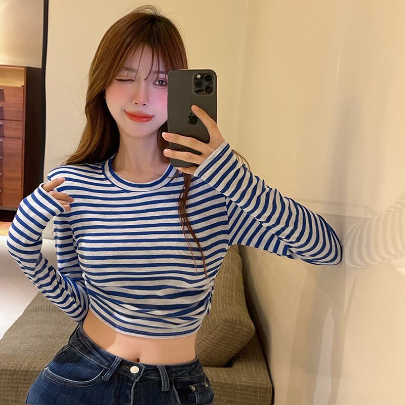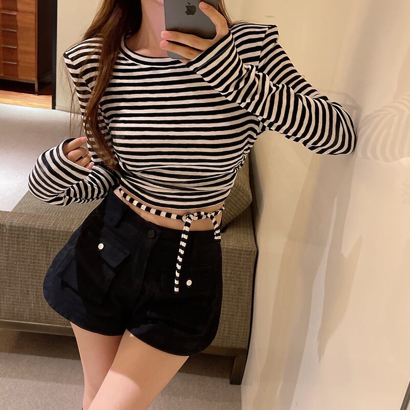 ストライプTシャツ シャツ ギャザーショートトップス オータムウィンター ロング 秋物 冬物 ガールズファッション29200420017