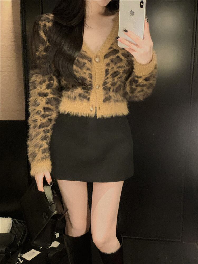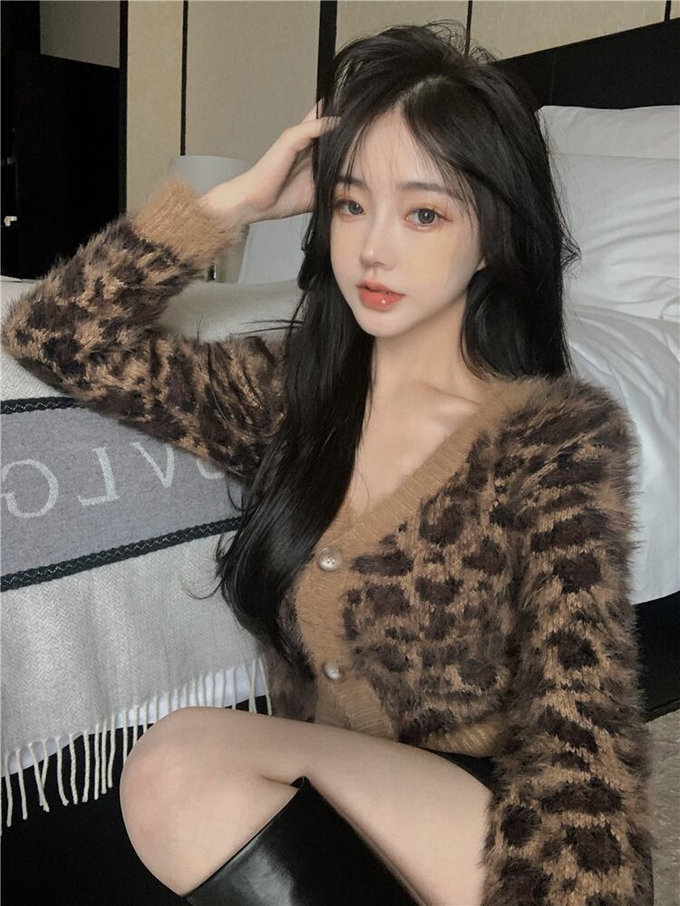 スタイルスタンダードレオパードプリント柄ニットカーディガンショートセーター コート カジュアルジャケット レトロ ウィンター 冬物 ガールズファッション41744001380