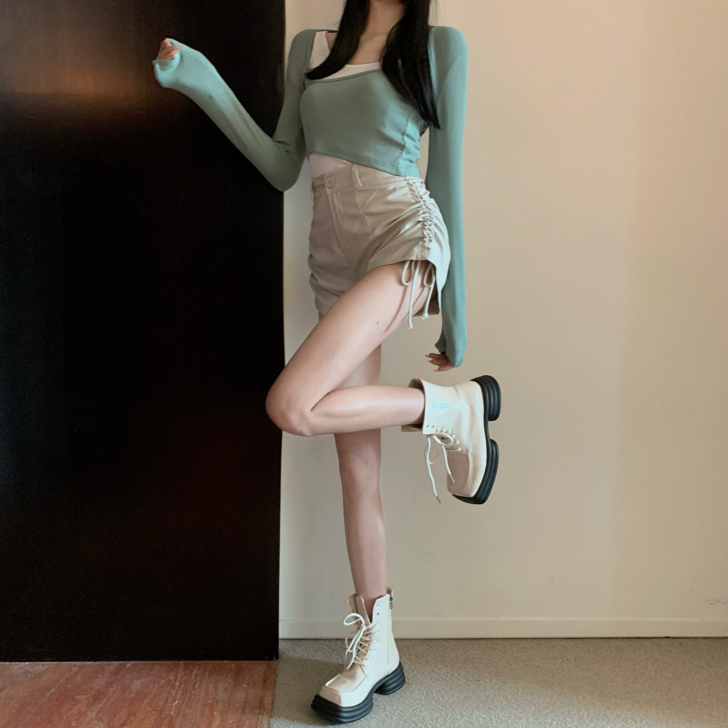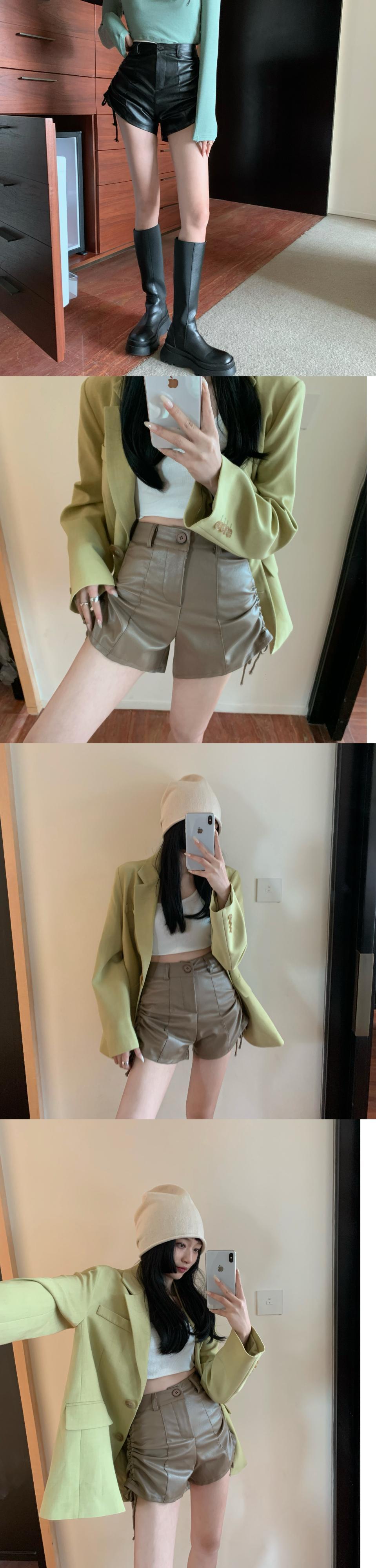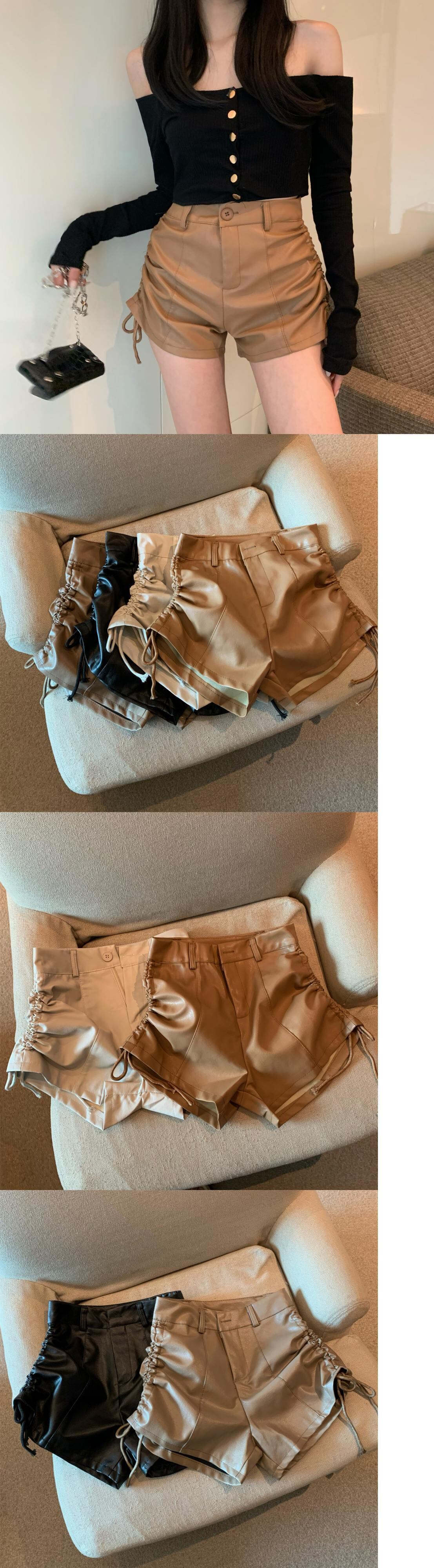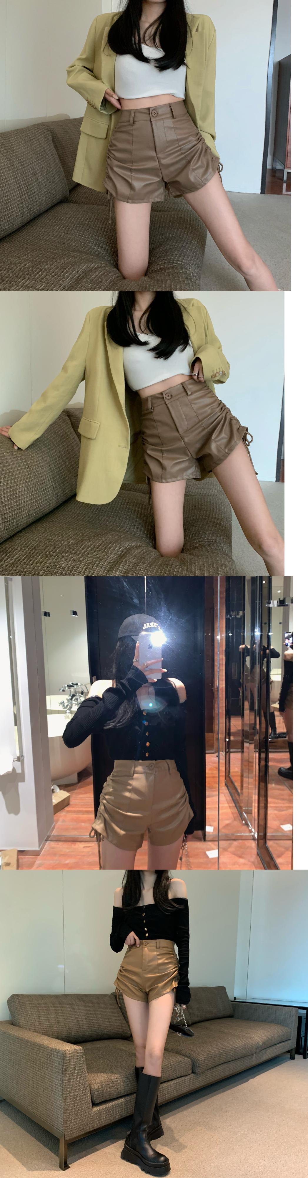 ギャザーカジュアルパンツ オータム薄手レザーハイウェストウェストスリムスカート ショート 秋物 ガールズファッション12229732566