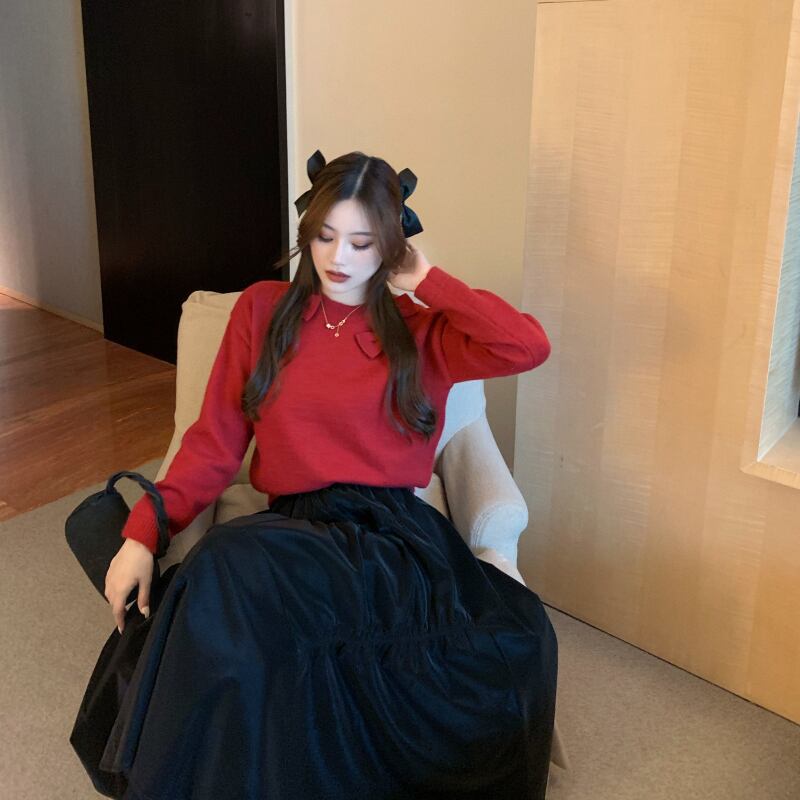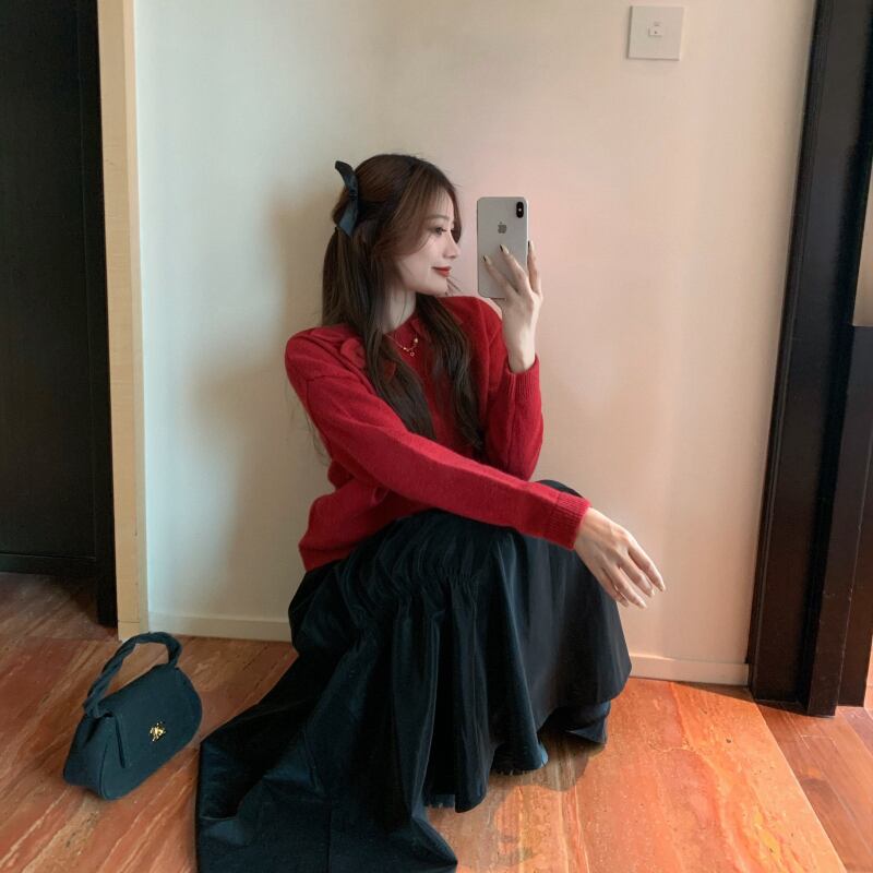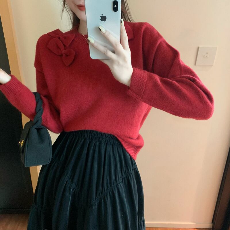 スタンダードラウンドネックセーター オータムウィンタールーズ薄手トップス ロング リボン レトロ 大人ガーリー スウィート キュート カジュアル 秋物 冬物 Oネック ガールズファッション3594374940