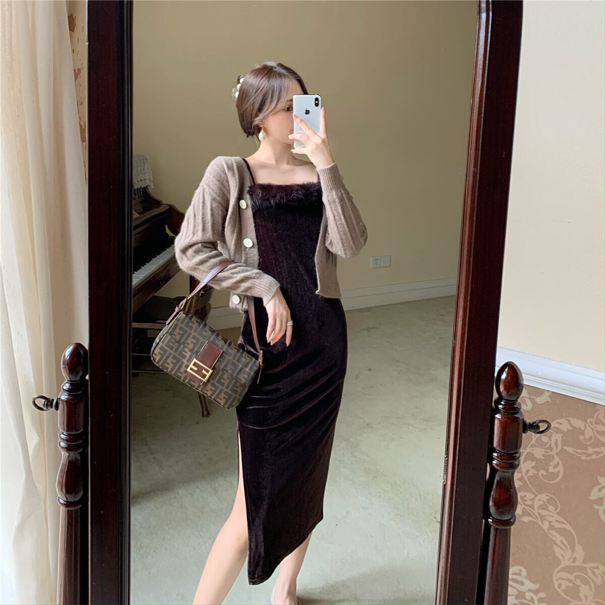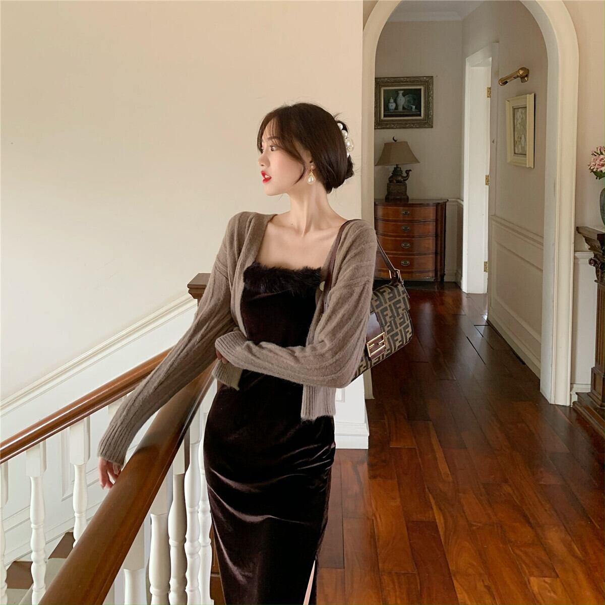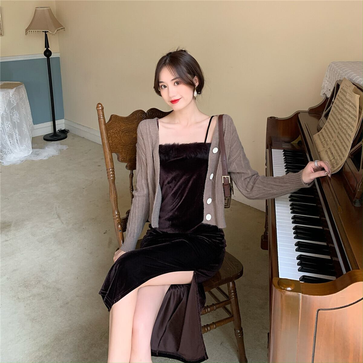 オータムウィンタースタンダードベルベットドレス ルーズセーター カーディガン ロング レトロ 秋物 冬物 ガールズファッション44852397330