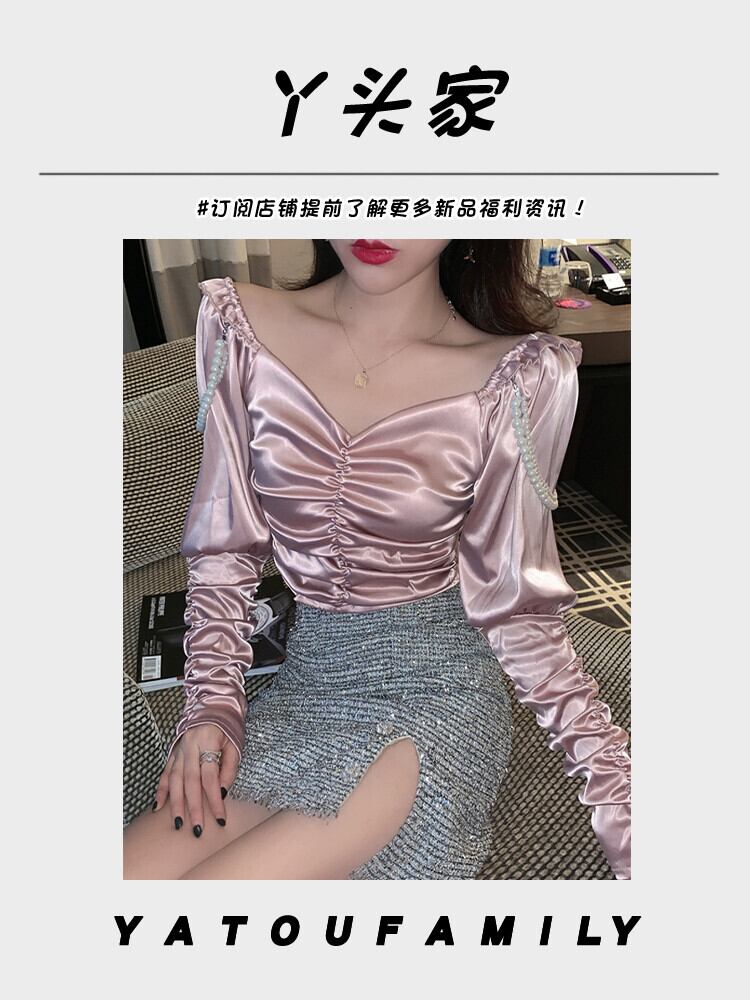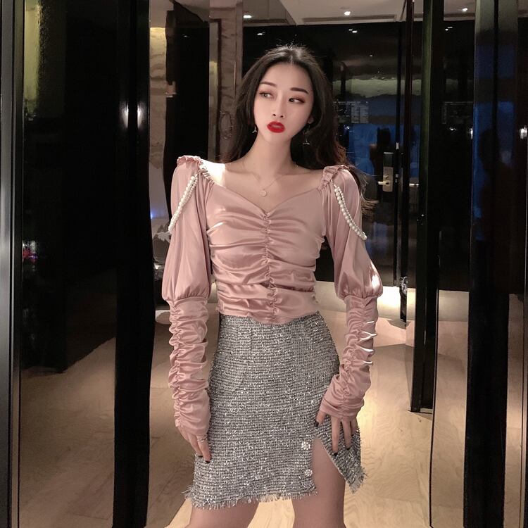 Vネックプリーツシャツ オータムウィンターパールチェーン トップス ショート ロング 秋物 冬物 真珠 ガールズファッション92580212149
