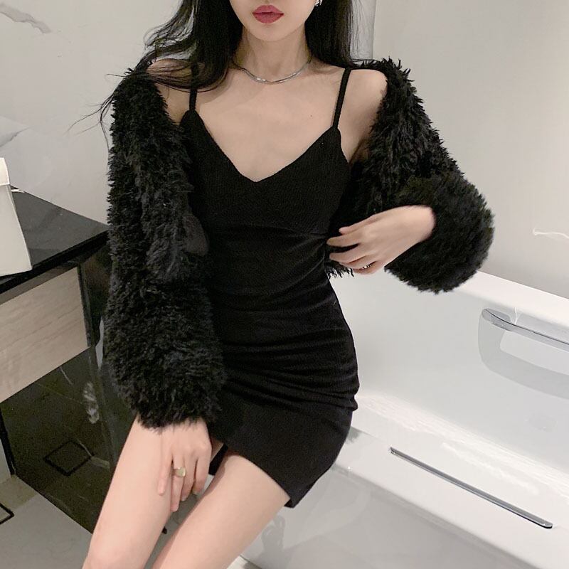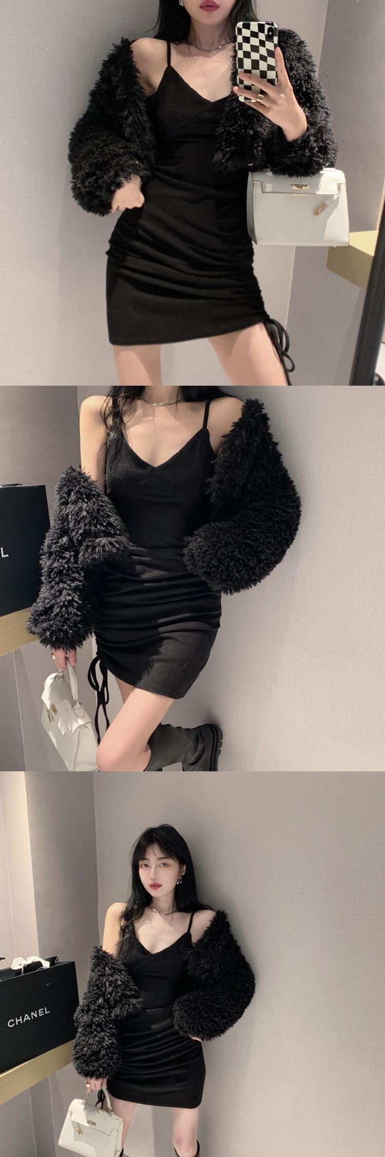 レディースオータムウィンターショートファーコート Vネックギャザープリーツドレス ロング 秋物 冬物 ガールズファッション9504513377