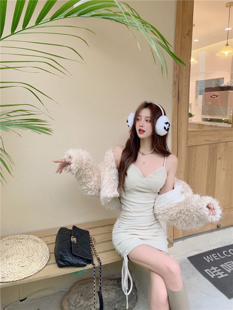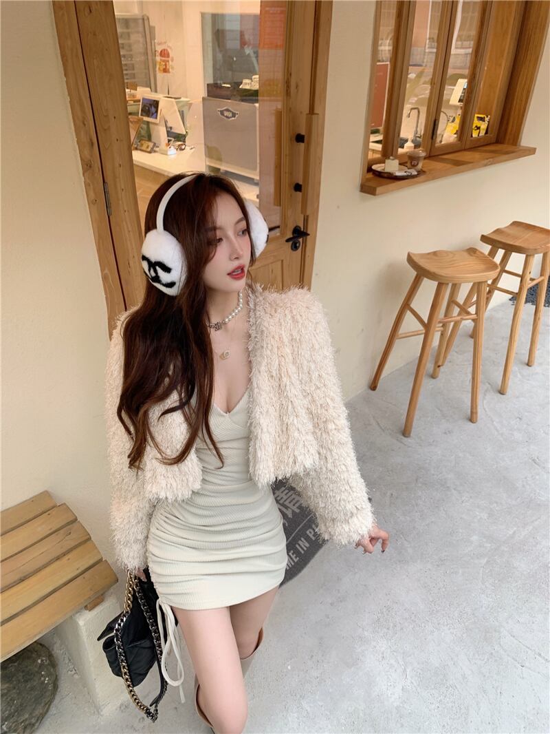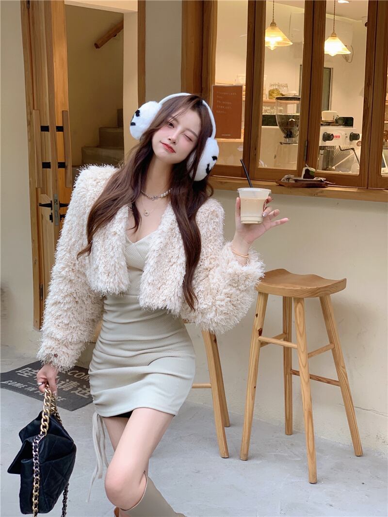 Vネックギャザープリーツドレス オータムウィンターショート長袖スリーブジャケット ロング 秋物 冬物 ガールズファッション96964716307