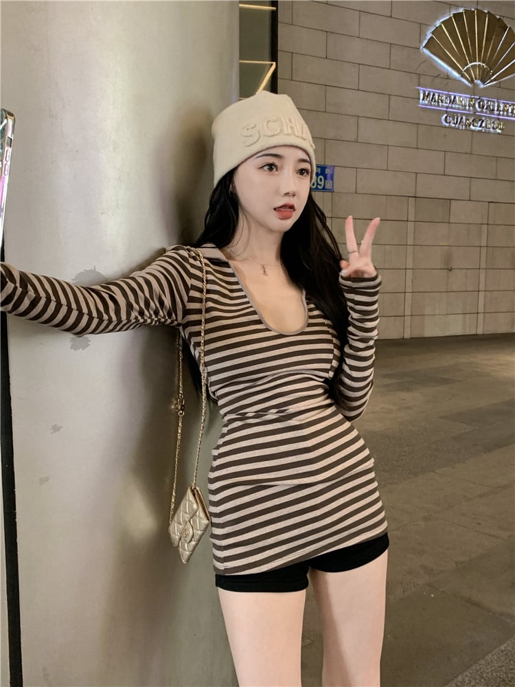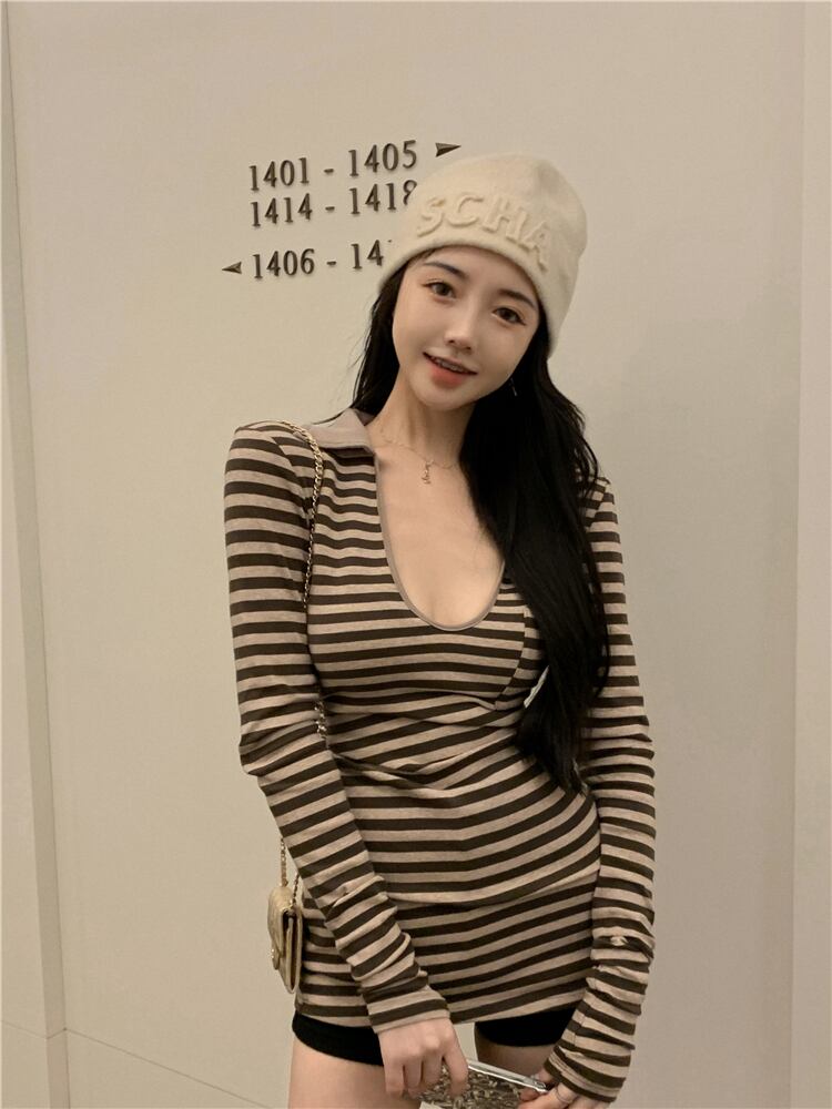 ストライプTシャツ シャツ オータムスタイルスタンダードVネックトップス ロング レトロ 秋物 ピュア ガールズファッション68642872915