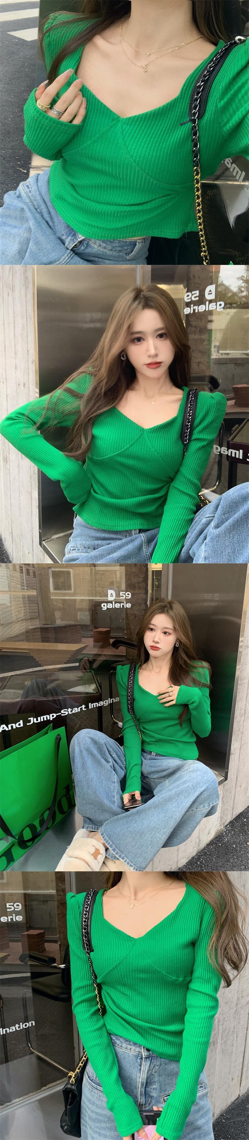 スタンダードスリーブTシャツ オータムウィンターショートスリム薄手ソリッド カラーニットトップス レトロ 秋物 冬物 ソリッドカラー スクウェア ガールズファッション15952573290