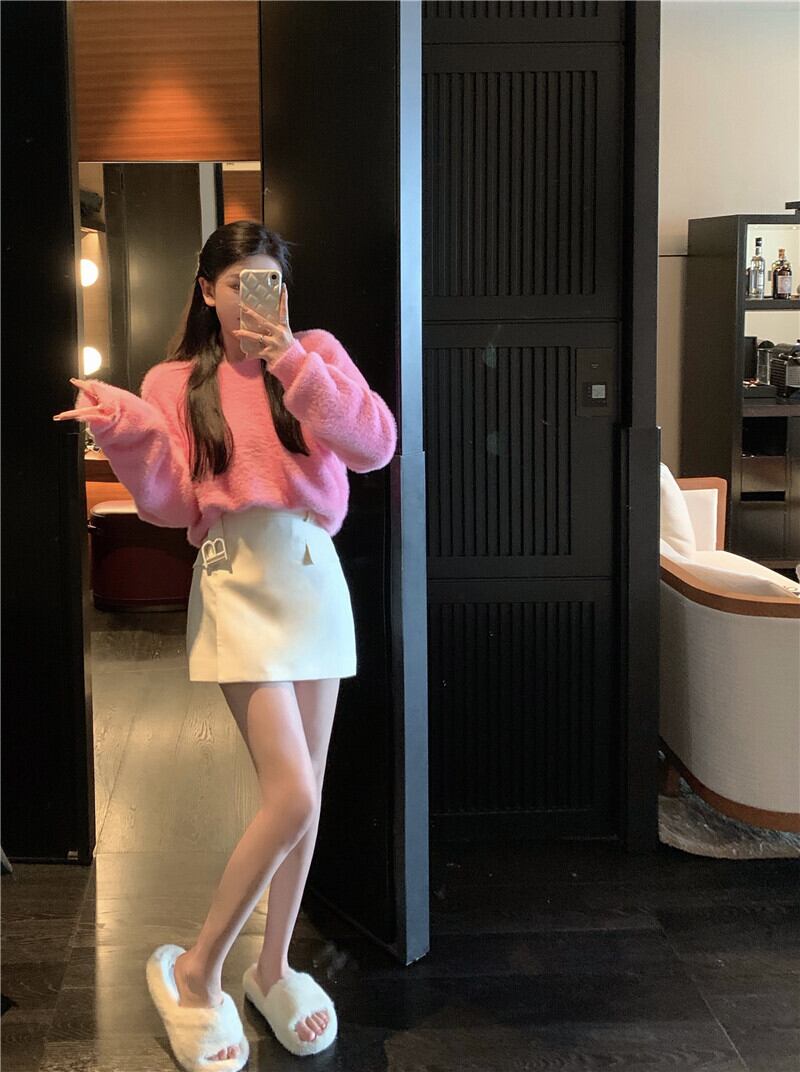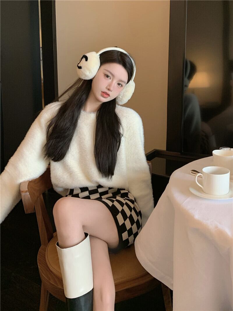 色:ローズピンクのセーター,白いセーター,チェック柄ニットスカート
