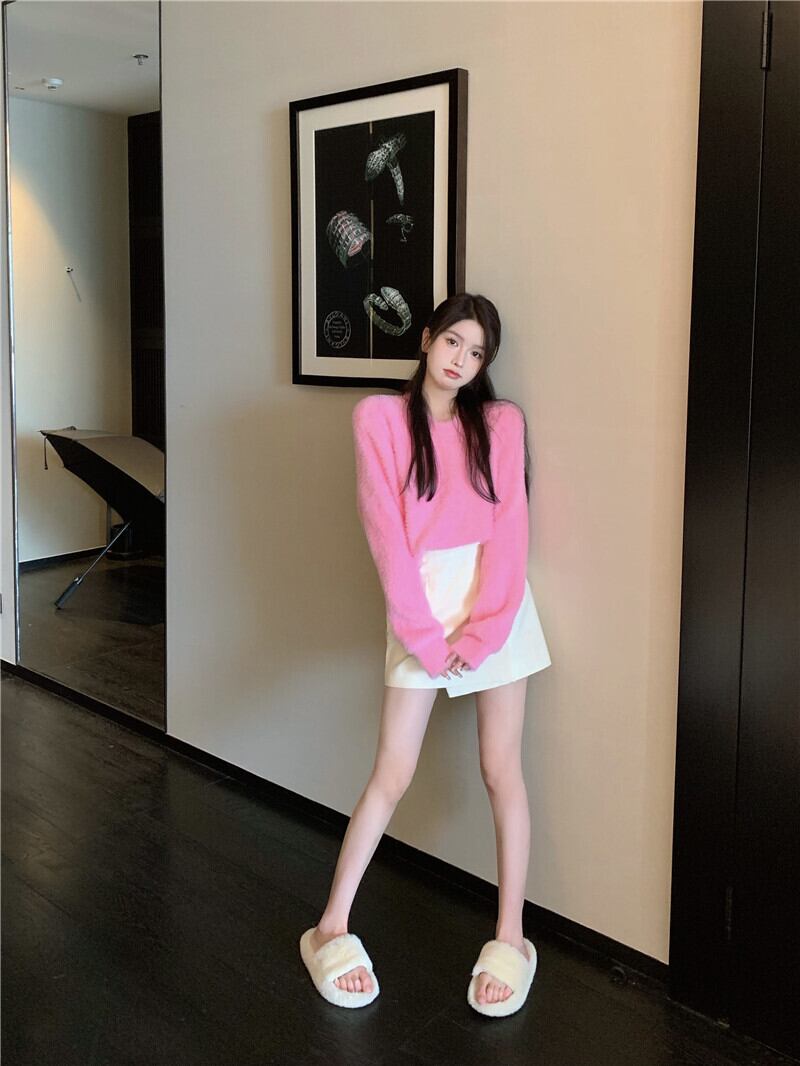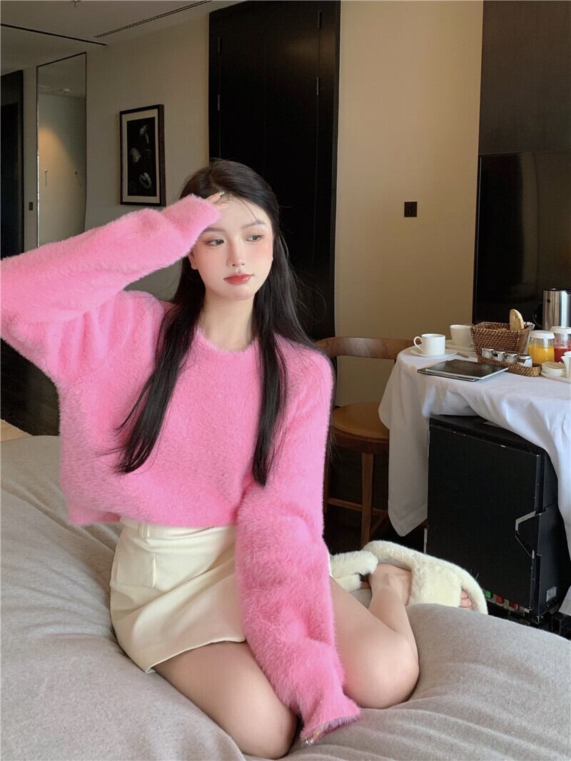 セーター スタンダードルーズニットオータムウィンタースタイルトップス ロング ピンク レトロ 秋物 冬物 ガールズファッション47782667792