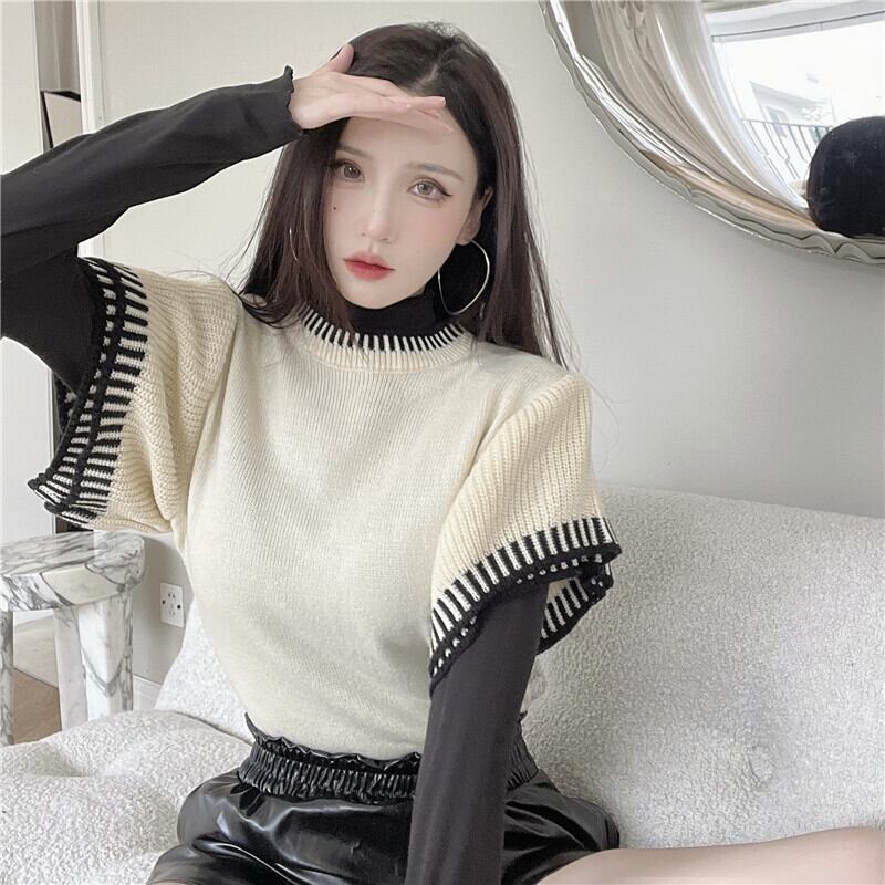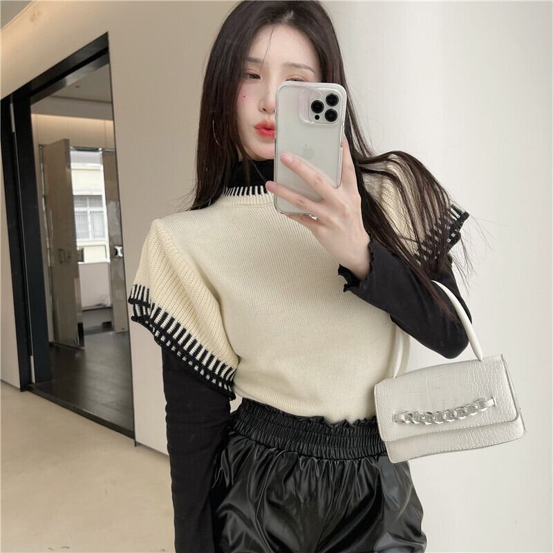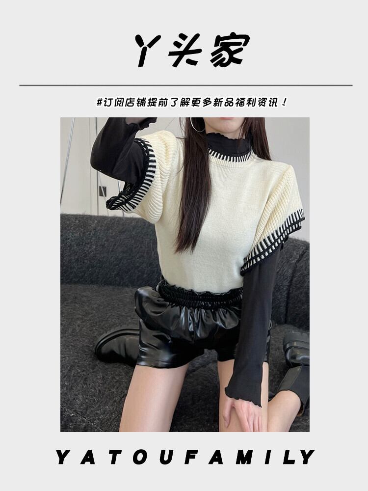 カラーラウンドネックセーター オータムウィンタースタイルスタンダードハイウェストカジュアルレザーパンツ ロング レトロ 秋物 冬物 Oネック ガールズファッション33400573489