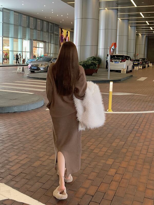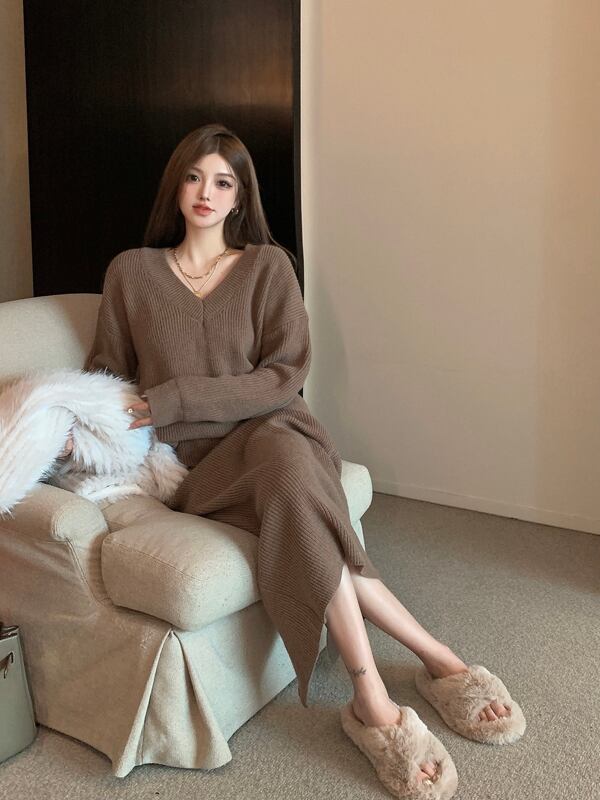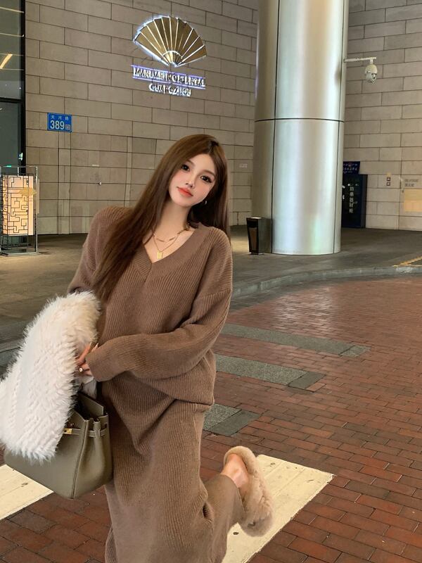 スタンダードルーズVネックプルオーバー セーター レディースオータムウィンターハイウェストウェストスカート レトロ 秋物 冬物 ガールズファッション6563757537