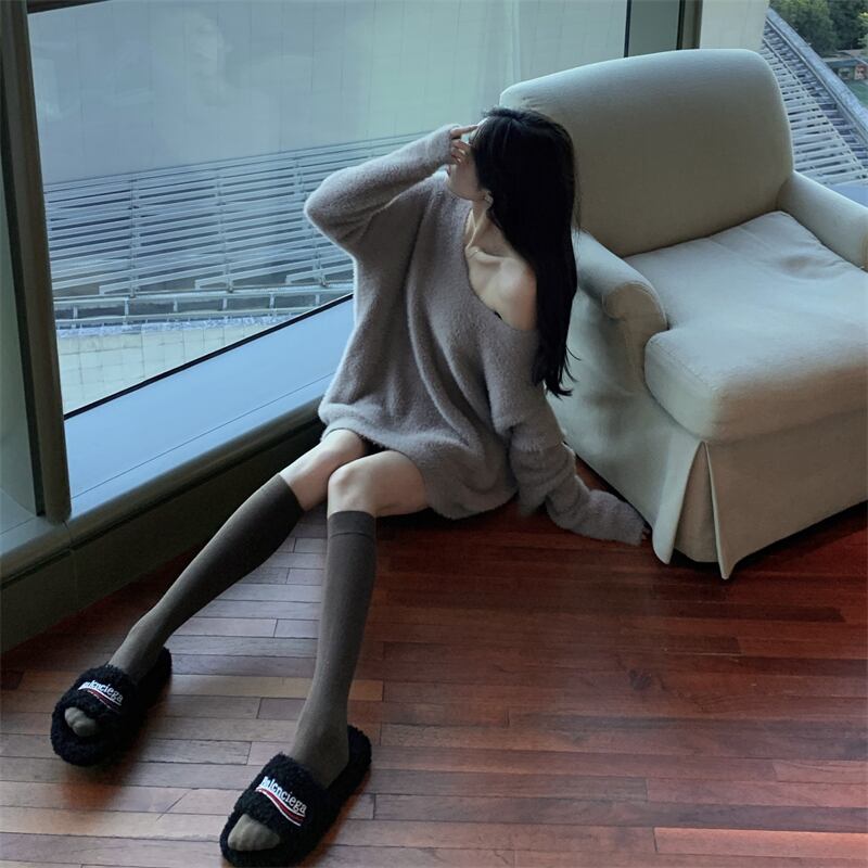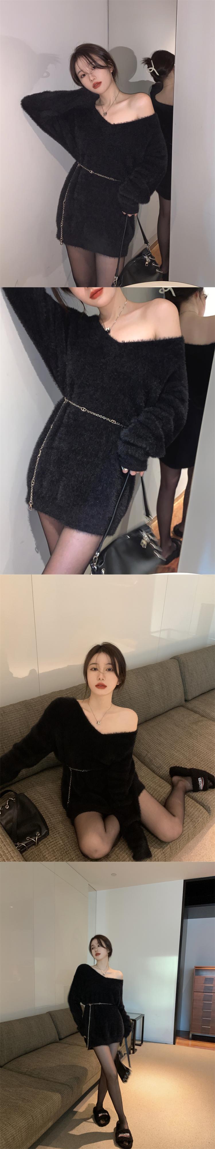 Vネックストラップレスセーター スタンダードルーズプルオーバー ロング レトロ ウィンター 冬物 ガールズファッション60004597727